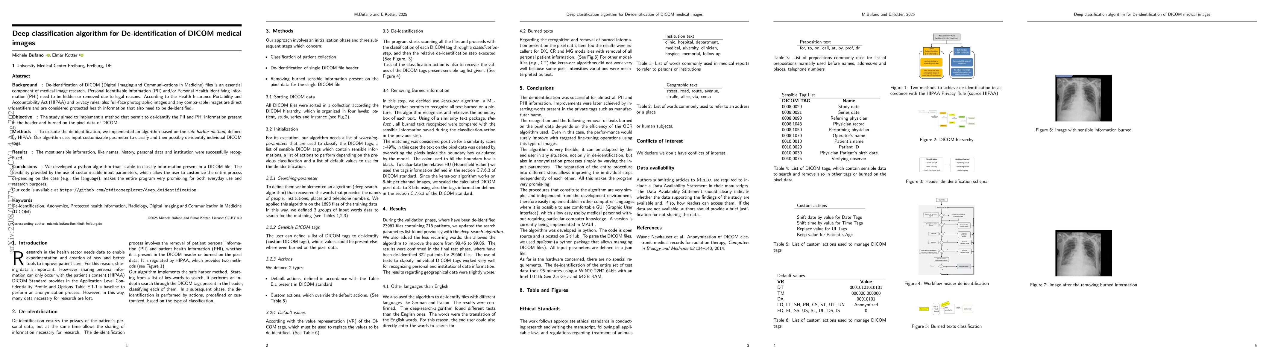 Background : De-identification of DICOM (Digital Imaging and Communi-cations in Medicine) files is an essential component of medical image research. Personal Identifiable Information (PII) and/or Personal Health Identifying Information (PHI) need to be hidden or removed due to legal reasons. According to the Health Insurance Portability and Accountability Act (HIPAA) and privacy rules, also full-face photographic images and any compa-rable images are direct identifiers and are considered protected health information that also need to be de-identified. Objective : The study aimed to implement a method that permit to de-identify the PII and PHI information present in the header and burned on the pixel data of DICOM. Methods : To execute the de-identification, we implemented an algorithm based on the safe harbor method, defined by HIPAA. Our algorithm uses input customizable parameter to classify and then possibly de-identify individual DICOM tags. Results : The most sensible information, like names, history, personal data and institution were successfully recognized. Conclusions : We developed a python algorithm that is able to classify infor-mation present in a DICOM file. The flexibility provided by the use of customi-zable input parameters, which allow the user to customize the entire process de-pending on the case (e.g., the language), makes the entire program very promis-ing for both everyday use and research purposes. Our code is available at https://github.com/rtdicomexplorer/deep_deidentification.