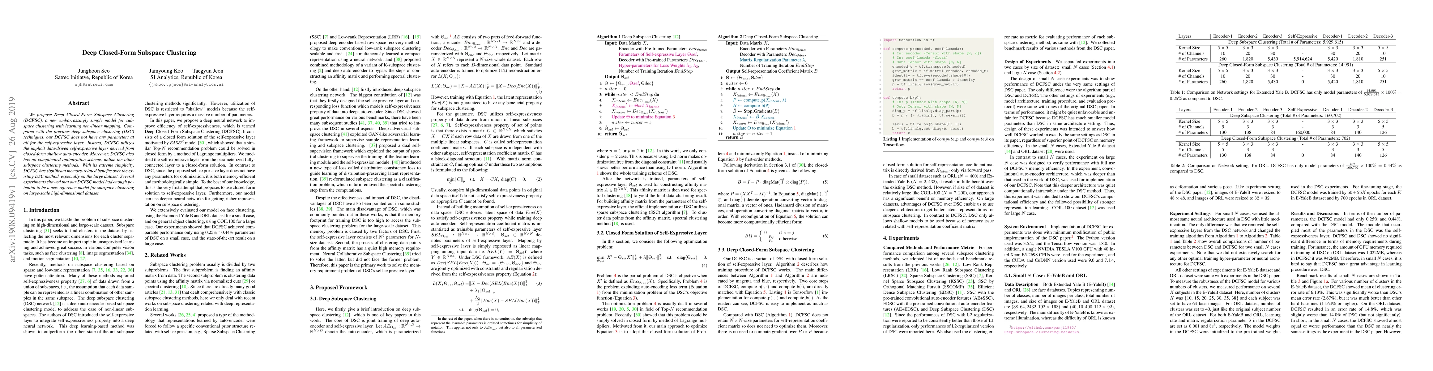 The paper introduces Deep Closed-Form Subspace Clustering (DCFSC), a simple model for subspace clustering that uses a closed-form shallow auto-encoder for non-linear mapping without parameters or complex optimization, offering memory benefits over existing deep subspace clustering methods and showing potential for large-scale datasets.