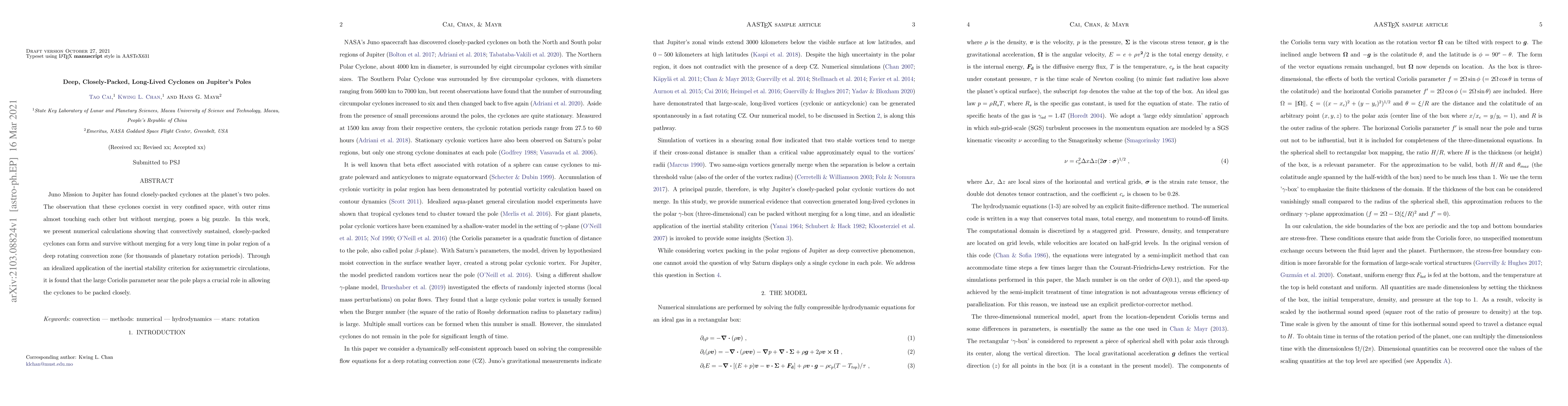 The Juno Mission discovered closely-packed, long-lived cyclones at Jupiter's poles, where they coexist without merging. Numerical simulations reveal that these cyclones can persist due to the large Coriolis parameter in the planet's deep rotating convection zone, facilitated by convectively sustained inertial stability.
