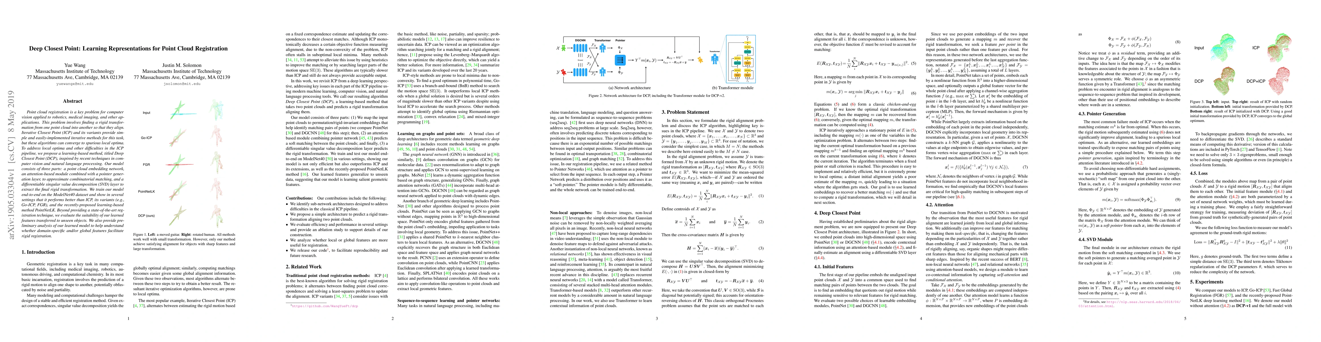 This paper proposes Deep Closest Point (DCP), a learning-based method for point cloud registration, which outperforms traditional ICP and its variants by incorporating a point cloud embedding network, an attention-based module, and a differentiable SVD layer. The model is trained on ModelNet40 and shows superior performance in registration tasks, with an evaluation on the transferability of learned features to unseen objects.