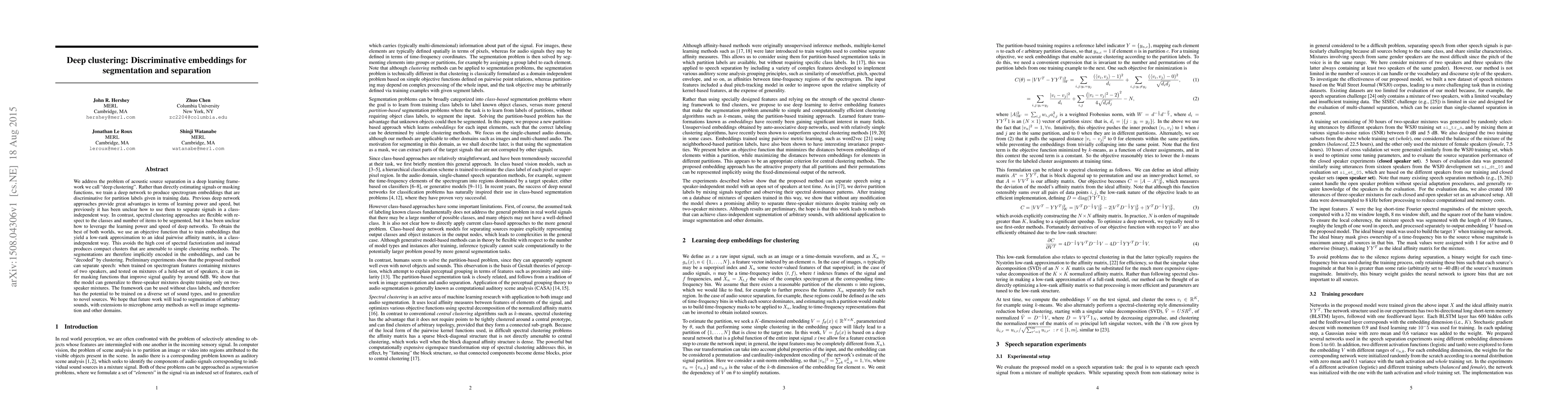 This paper proposes a "deep clustering" framework for acoustic source separation that trains deep networks to produce discriminative spectrogram embeddings for partition labels. The method aims to combine the flexibility of spectral clustering with the learning power of deep networks, achieving better generalization and signal separation quality.