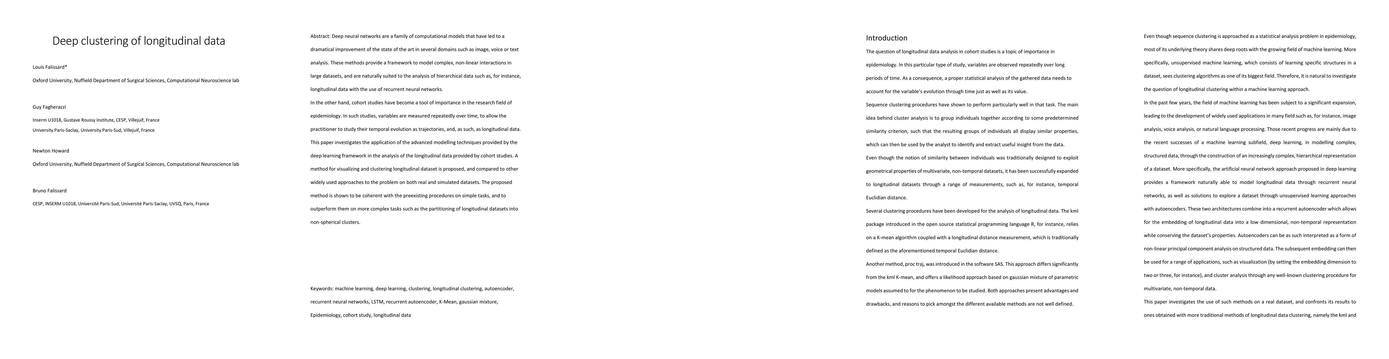 Deep neural networks are a family of computational models that have led to a dramatical improvement of the state of the art in several domains such as image, voice or text analysis. These methods provide a framework to model complex, non-linear interactions in large datasets, and are naturally suited to the analysis of hierarchical data such as, for instance, longitudinal data with the use of recurrent neural networks. In the other hand, cohort studies have become a tool of importance in the research field of epidemiology. In such studies, variables are measured repeatedly over time, to allow the practitioner to study their temporal evolution as trajectories, and, as such, as longitudinal data. This paper investigates the application of the advanced modelling techniques provided by the deep learning framework in the analysis of the longitudinal data provided by cohort studies. Methods: A method for visualizing and clustering longitudinal dataset is proposed, and compared to other widely used approaches to the problem on both real and simulated datasets. Results: The proposed method is shown to be coherent with the preexisting procedures on simple tasks, and to outperform them on more complex tasks such as the partitioning of longitudinal datasets into non-spherical clusters. Conclusion: Deep artificial neural networks can be used to visualize longitudinal data in a low dimensional manifold that is much simpler to interpret than traditional longitudinal plots are. Consequently, practitioners should start considering the use of deep artificial neural networks for the analysis of their longitudinal data in studies to come.