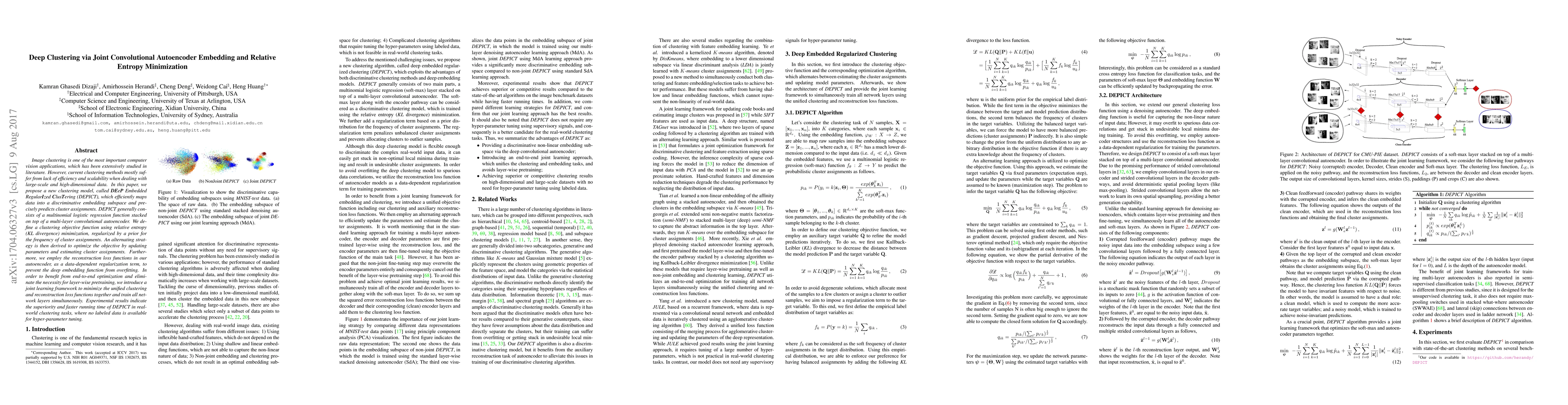 This paper introduces DEPICT, a novel clustering model combining a convolutional autoencoder with relative entropy minimization to efficiently cluster large-scale images. It employs joint learning to optimize both clustering and reconstruction losses, demonstrating superior performance and faster runtime compared to existing methods.