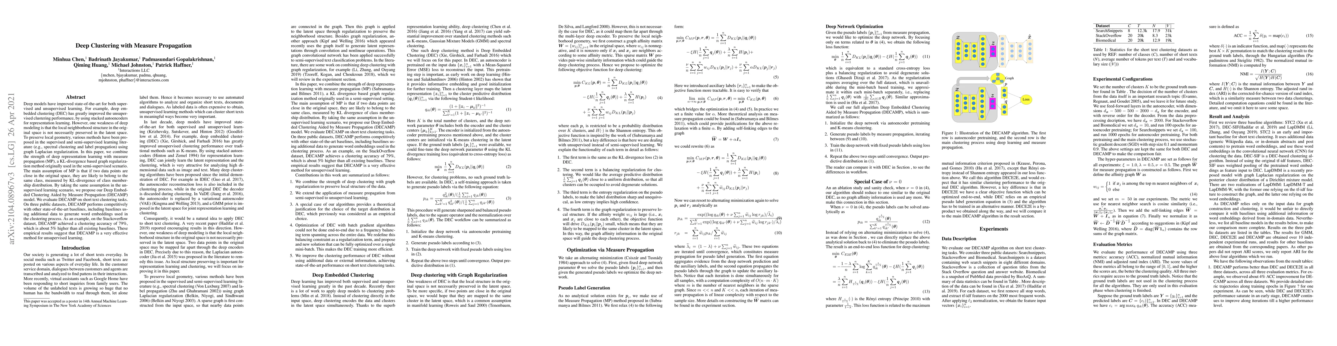 This paper proposes DECAMP, a Deep Embedded Clustering model enhanced by Measure Propagation to preserve local neighborhood structure in the latent space. DECAMP combines deep representation learning with KL-divergence based graph regularization, achieving competitive clustering accuracy on short text datasets, notably outperforming existing methods by about 5% on the Stackoverflow dataset.