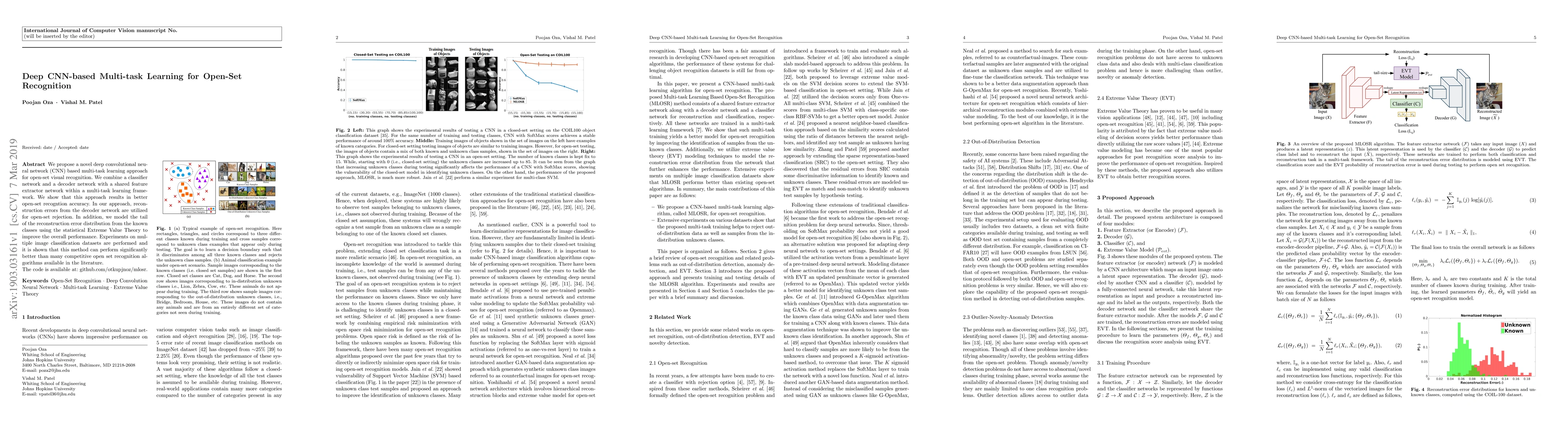 This paper introduces a deep CNN-based multi-task learning framework for open-set recognition, combining a classifier and decoder network with a shared feature extractor. The method utilizes reconstruction errors and Extreme Value Theory for improved open-set rejection, achieving superior performance on various image classification datasets compared to existing algorithms.