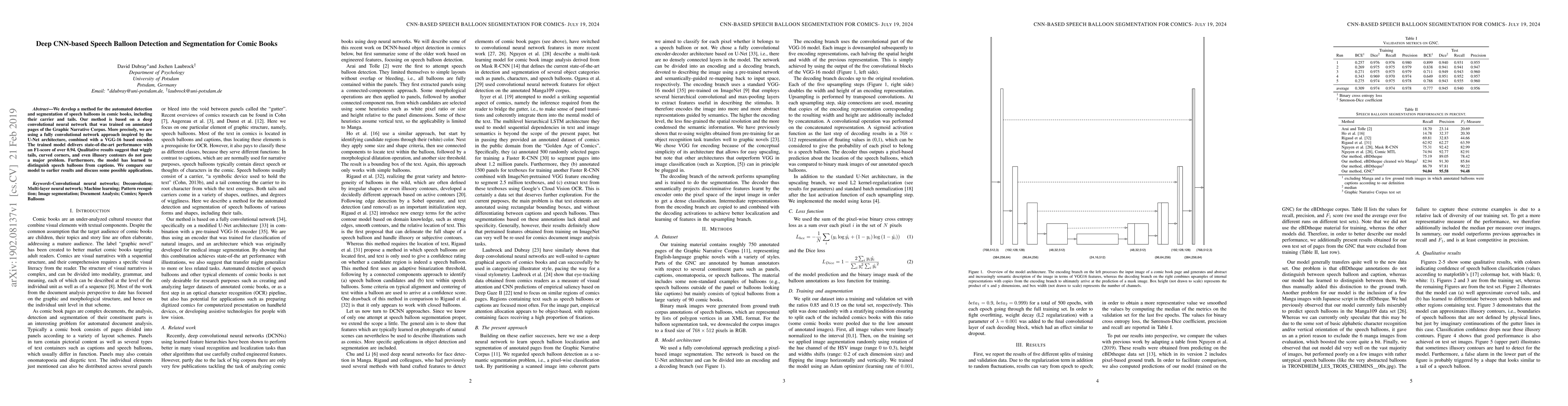 The research develops a method for automated detection and segmentation of speech balloons in comic books using a deep convolutional neural network (CNN) based on the U-Net architecture combined with a VGG-16 encoder. The model was trained on annotated pages from the Graphic Narrative Corpus (GNC).