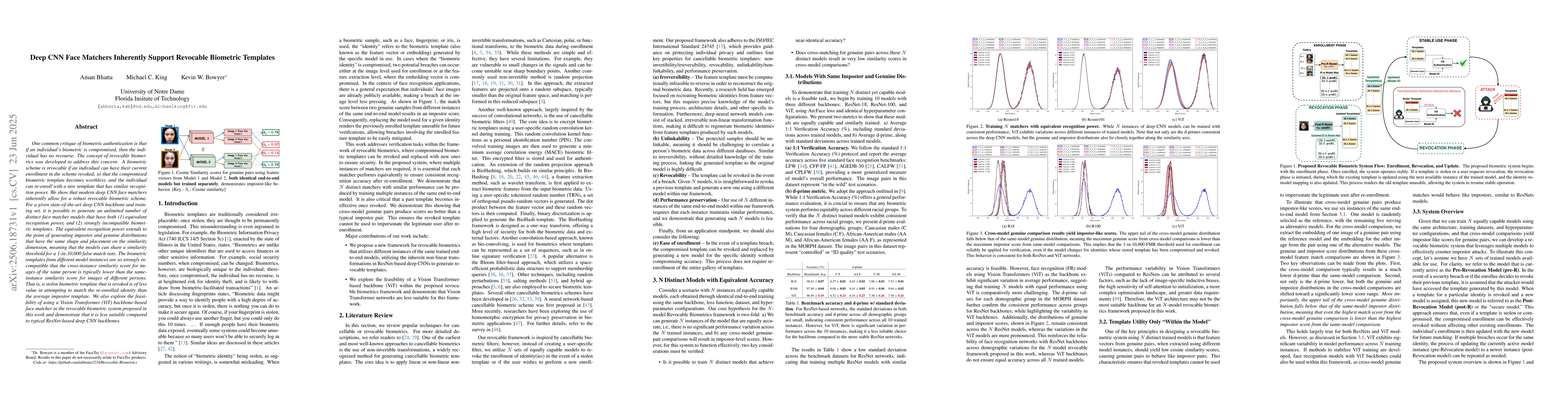 One common critique of biometric authentication is that if an individual's biometric is compromised, then the individual has no recourse. The concept of revocable biometrics was developed to address this concern. A biometric scheme is revocable if an individual can have their current enrollment in the scheme revoked, so that the compromised biometric template becomes worthless, and the individual can re-enroll with a new template that has similar recognition power. We show that modern deep CNN face matchers inherently allow for a robust revocable biometric scheme. For a given state-of-the-art deep CNN backbone and training set, it is possible to generate an unlimited number of distinct face matcher models that have both (1) equivalent recognition power, and (2) strongly incompatible biometric templates. The equivalent recognition power extends to the point of generating impostor and genuine distributions that have the same shape and placement on the similarity dimension, meaning that the models can share a similarity threshold for a 1-in-10,000 false match rate. The biometric templates from different model instances are so strongly incompatible that the cross-instance similarity score for images of the same person is typically lower than the same-instance similarity score for images of different persons. That is, a stolen biometric template that is revoked is of less value in attempting to match the re-enrolled identity than the average impostor template. We also explore the feasibility of using a Vision Transformer (ViT) backbone-based face matcher in the revocable biometric system proposed in this work and demonstrate that it is less suitable compared to typical ResNet-based deep CNN backbones.