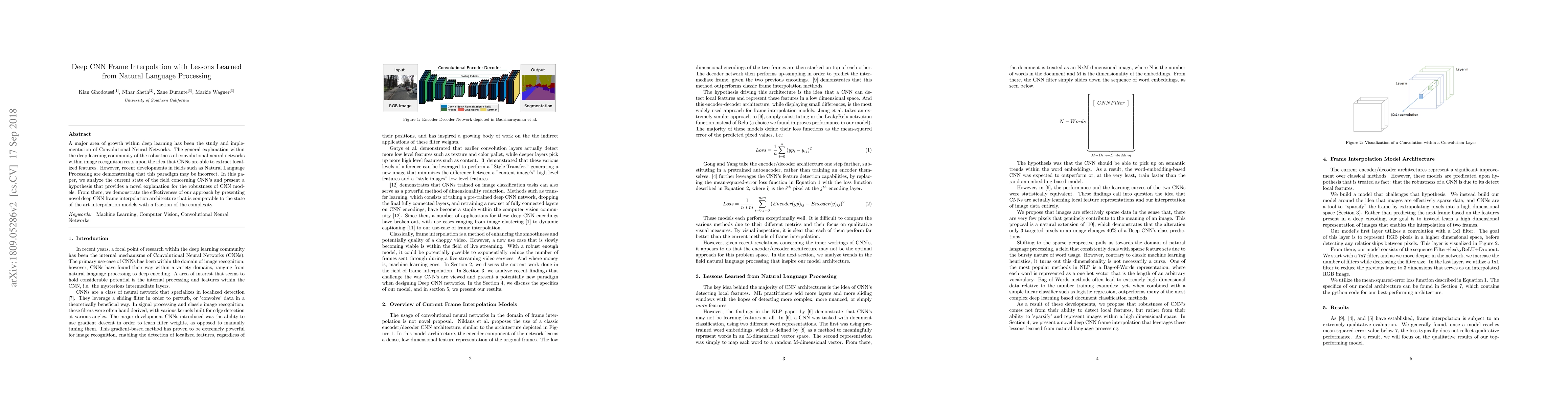 This paper proposes a novel hypothesis to explain the robustness of CNNs, drawing insights from Natural Language Processing. It introduces a new deep CNN frame interpolation architecture that achieves state-of-the-art performance with significantly reduced complexity.