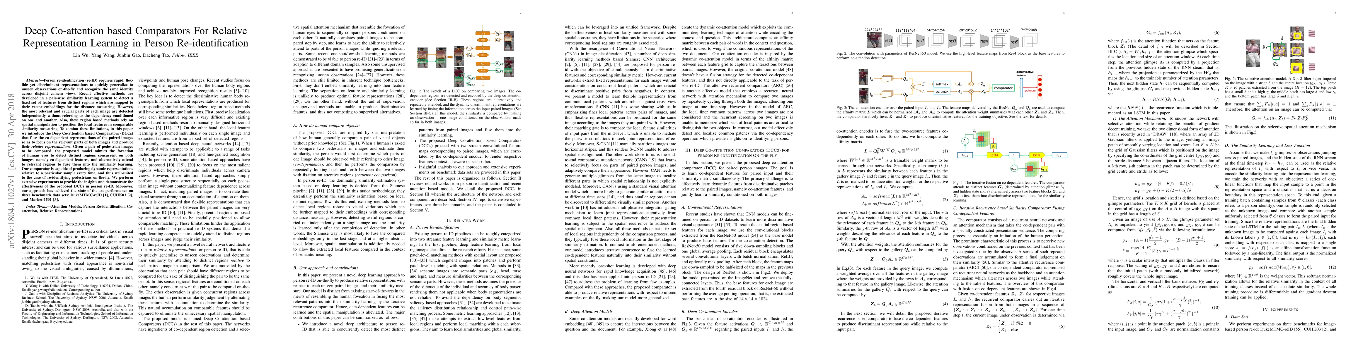 Person re-identification (re-ID) requires rapid, flexible yet discriminant representations to quickly generalize to unseen observations on-the-fly and recognize the same identity across disjoint camera views. Recent effective methods are developed in a pair-wise similarity learning system to detect a fixed set of features from distinct regions which are mapped to their vector embeddings for the distance measuring. However, the most relevant and crucial parts of each image are detected independently without referring to the dependency conditioned on one and another. Also, these region based methods rely on spatial manipulation to position the local features in comparable similarity measuring. To combat these limitations, in this paper we introduce the Deep Co-attention based Comparators (DCCs) that fuse the co-dependent representations of the paired images so as to focus on the relevant parts of both images and produce their \textit{relative representations}. Given a pair of pedestrian images to be compared, the proposed model mimics the foveation of human eyes to detect distinct regions concurrent on both images, namely co-dependent features, and alternatively attend to relevant regions to fuse them into the similarity learning. Our comparator is capable of producing dynamic representations relative to a particular sample every time, and thus well-suited to the case of re-identifying pedestrians on-the-fly. We perform extensive experiments to provide the insights and demonstrate the effectiveness of the proposed DCCs in person re-ID. Moreover, our approach has achieved the state-of-the-art performance on three benchmark data sets: DukeMTMC-reID \cite{DukeMTMC}, CUHK03 \cite{FPNN}, and Market-1501 \cite{Market1501}.