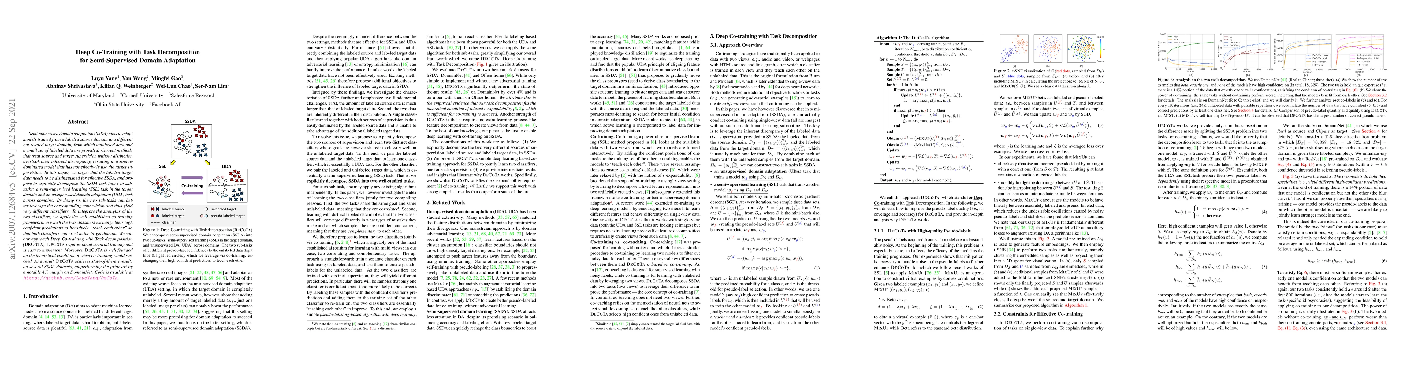 A new approach called Deep Co-training with Task Decomposition (DeCoTa) improves semi-supervised domain adaptation by distinguishing labeled target data and applying co-training to leverage both supervision types.