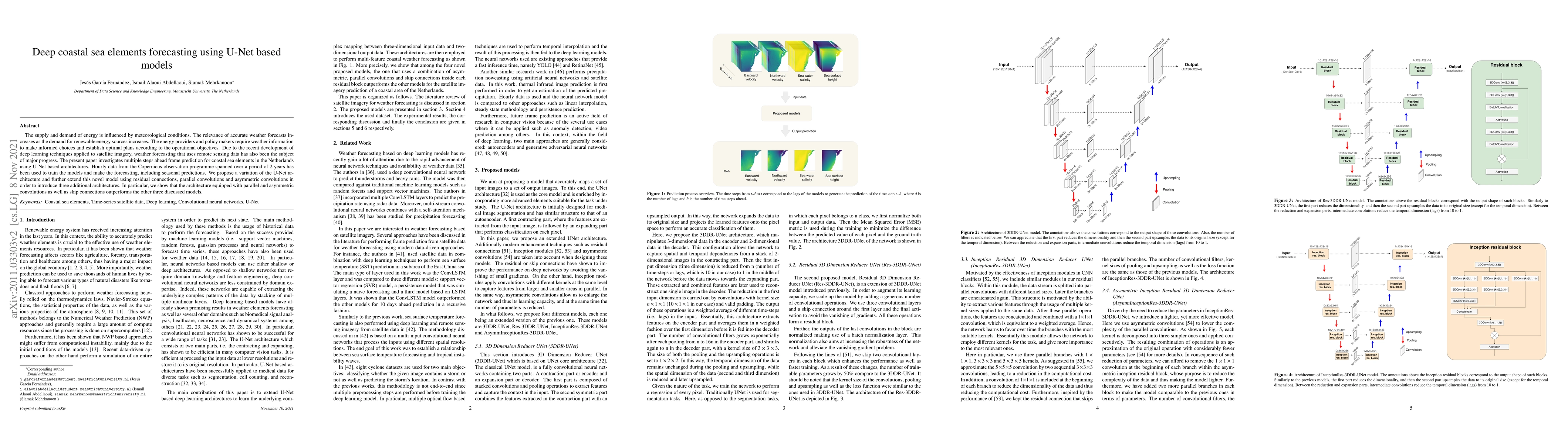 This paper explores advanced U-Net based deep learning models for forecasting coastal sea elements in the Netherlands, utilizing two years of hourly data from Copernicus. The study introduces several model variations, including residual connections and asymmetric convolutions, and finds that the model with parallel and asymmetric convolutions, along with skip connections, provides the most accurate predictions.