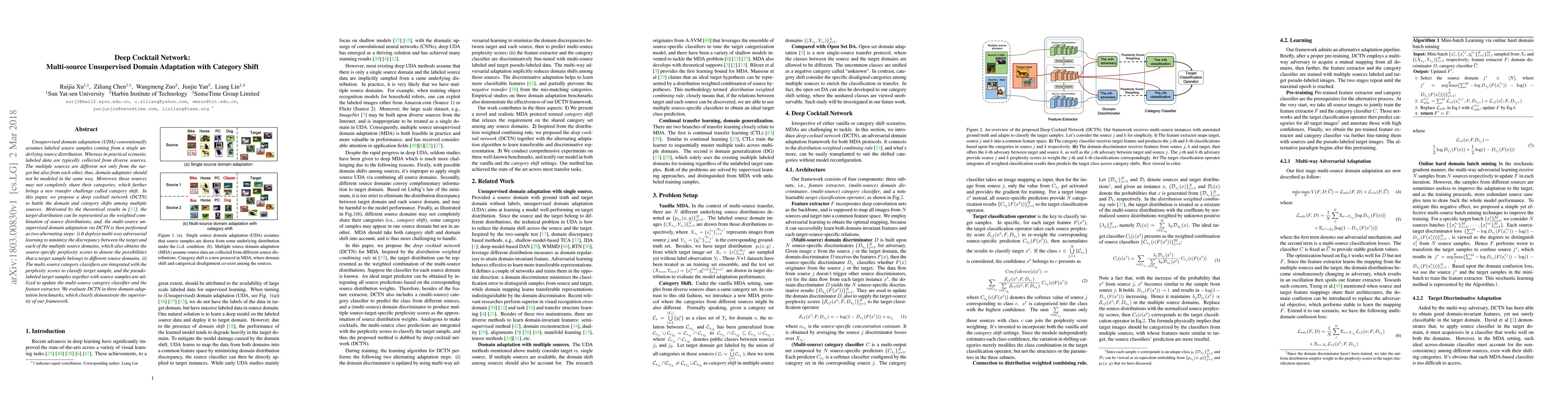 This paper introduces a Deep Cocktail Network (DCTN) to tackle multi-source unsupervised domain adaptation with category shift challenges. The DCTN uses multi-way adversarial learning and integrates category classifiers with source-specific perplexity scores to adapt to diverse source distributions and handle category shifts, demonstrating superior performance in domain adaptation benchmarks.