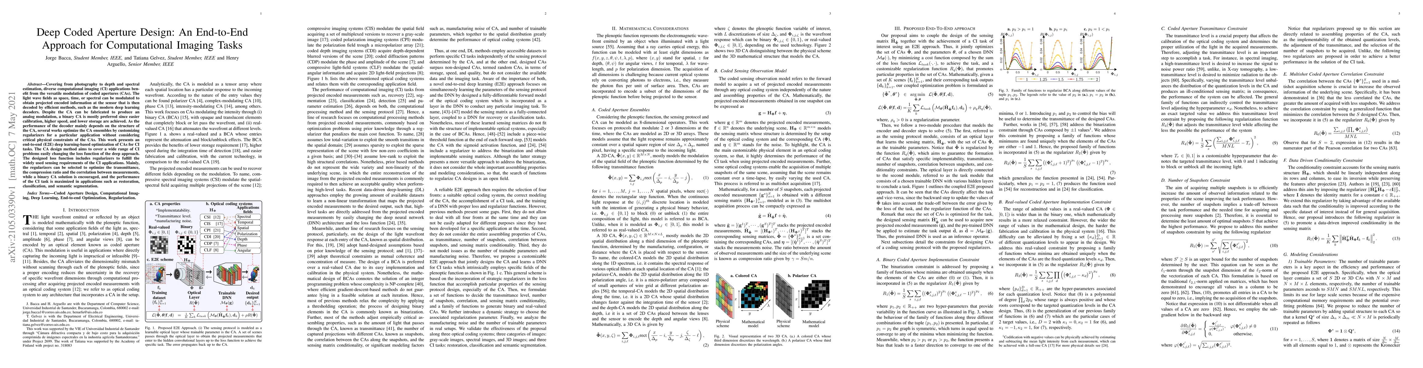 This paper proposes an end-to-end deep learning method for optimizing binary coded apertures (CAs) for various computational imaging tasks, focusing on maximizing performance through adaptable loss functions that consider physical constraints and sensing requirements. The approach aims to enhance applications like restoration, classification, and segmentation by efficiently modulating light waves.