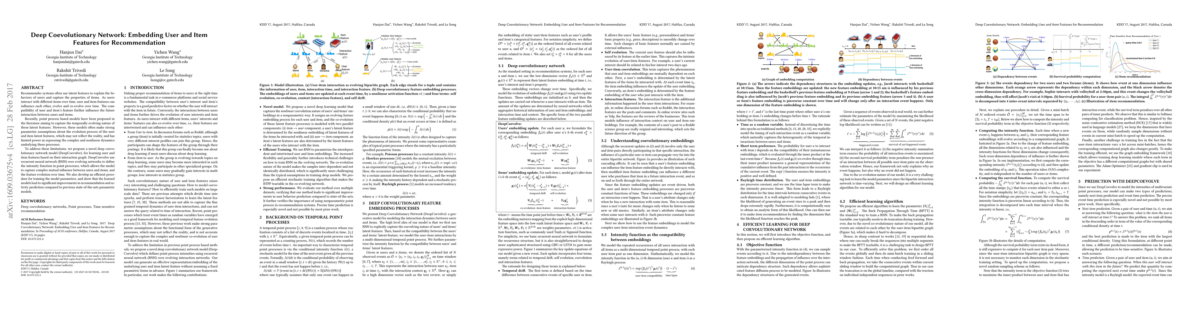 A new deep coevolutionary network model is proposed to learn user and item features based on their interaction graph, capturing complex mutual influence and feature evolution over time. The model improves recommendation and activity prediction compared to existing parametric models.