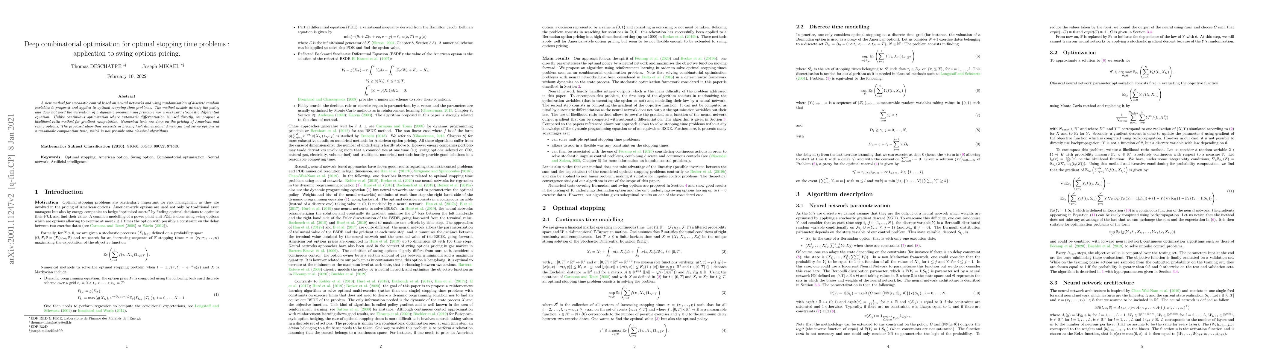 A new method for stochastic control based on neural networks and using randomisation of discrete random variables is proposed and applied to optimal stopping time problems. The method models directly the policy and does not need the derivation of a dynamic programming principle nor a backward stochastic differential equation. Unlike continuous optimization where automatic differentiation is used directly, we propose a likelihood ratio method for gradient computation. Numerical tests are done on the pricing of American and swing options. The proposed algorithm succeeds in pricing high dimensional American and swing options in a reasonable computation time, which is not possible with classical algorithms.
