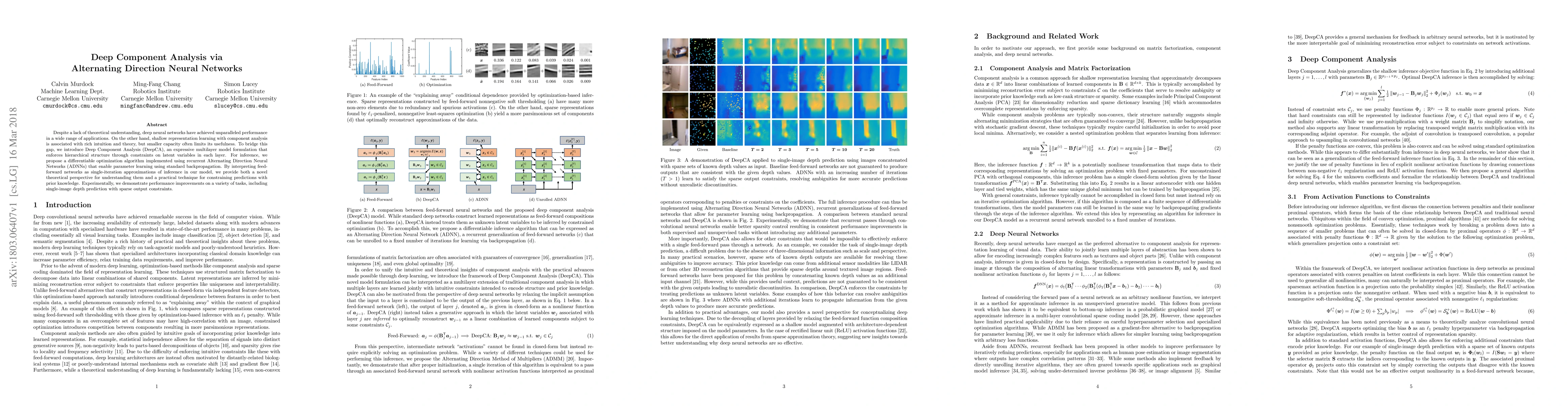 Despite a lack of theoretical understanding, deep neural networks have achieved unparalleled performance in a wide range of applications. On the other hand, shallow representation learning with component analysis is associated with rich intuition and theory, but smaller capacity often limits its usefulness. To bridge this gap, we introduce Deep Component Analysis (DeepCA), an expressive multilayer model formulation that enforces hierarchical structure through constraints on latent variables in each layer. For inference, we propose a differentiable optimization algorithm implemented using recurrent Alternating Direction Neural Networks (ADNNs) that enable parameter learning using standard backpropagation. By interpreting feed-forward networks as single-iteration approximations of inference in our model, we provide both a novel theoretical perspective for understanding them and a practical technique for constraining predictions with prior knowledge. Experimentally, we demonstrate performance improvements on a variety of tasks, including single-image depth prediction with sparse output constraints.