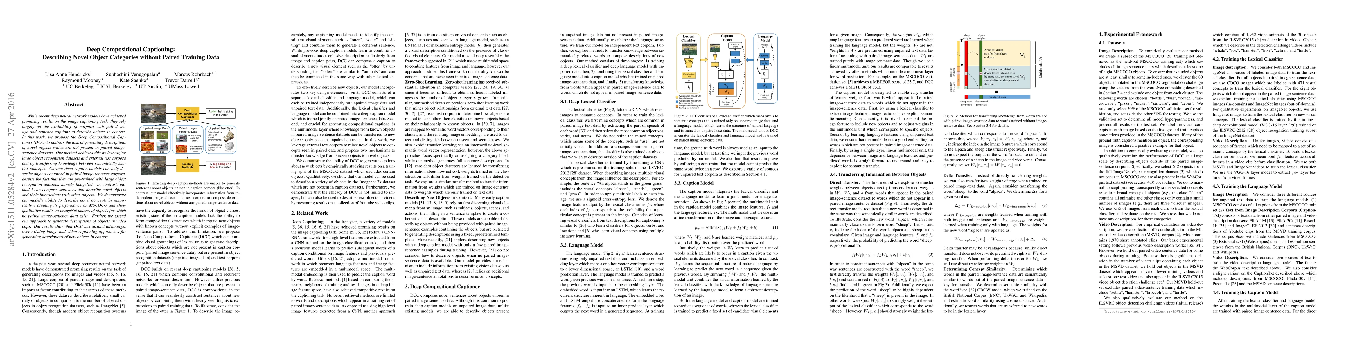 This paper introduces the Deep Compositional Captioner (DCC), a model that generates descriptions for novel objects without relying on paired image-sentence training data. It leverages large object recognition datasets and external text corpora to transfer knowledge between semantically similar concepts, demonstrating its effectiveness on MSCOCO and ImageNet.