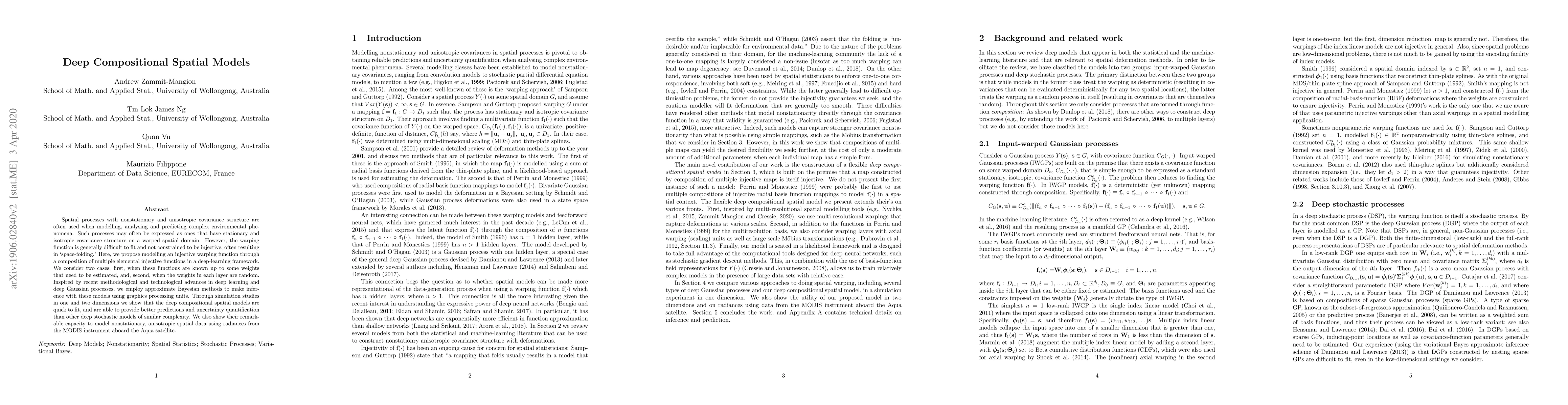 Spatial processes with nonstationary and anisotropic covariance structure are often used when modelling, analysing and predicting complex environmental phenomena. Such processes may often be expressed as ones that have stationary and isotropic covariance structure on a warped spatial domain. However, the warping function is generally difficult to fit and not constrained to be injective, often resulting in `space-folding.' Here, we propose modelling an injective warping function through a composition of multiple elemental injective functions in a deep-learning framework. We consider two cases; first, when these functions are known up to some weights that need to be estimated, and, second, when the weights in each layer are random. Inspired by recent methodological and technological advances in deep learning and deep Gaussian processes, we employ approximate Bayesian methods to make inference with these models using graphics processing units. Through simulation studies in one and two dimensions we show that the deep compositional spatial models are quick to fit, and are able to provide better predictions and uncertainty quantification than other deep stochastic models of similar complexity. We also show their remarkable capacity to model nonstationary, anisotropic spatial data using radiances from the MODIS instrument aboard the Aqua satellite.