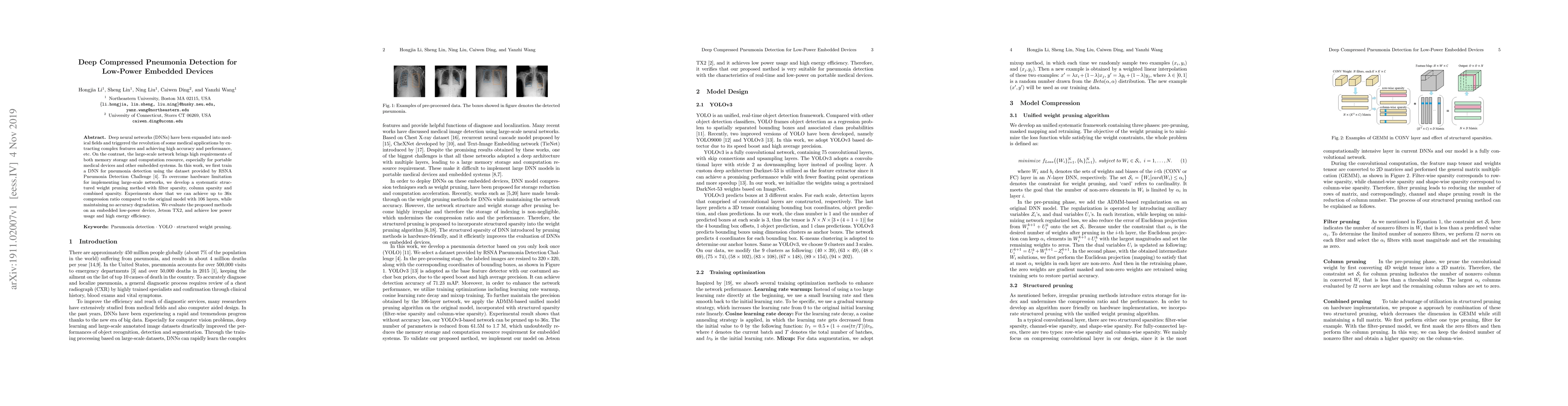 Deep neural networks (DNNs) have been expanded into medical fields and triggered the revolution of some medical applications by extracting complex features and achieving high accuracy and performance, etc. On the contrast, the large-scale network brings high requirements of both memory storage and computation resource, especially for portable medical devices and other embedded systems. In this work, we first train a DNN for pneumonia detection using the dataset provided by RSNA Pneumonia Detection Challenge. To overcome hardware limitation for implementing large-scale networks, we develop a systematic structured weight pruning method with filter sparsity, column sparsity and combined sparsity. Experiments show that we can achieve up to 36x compression ratio compared to the original model with 106 layers, while maintaining no accuracy degradation. We evaluate the proposed methods on an embedded low-power device, Jetson TX2, and achieve low power usage and high energy efficiency.