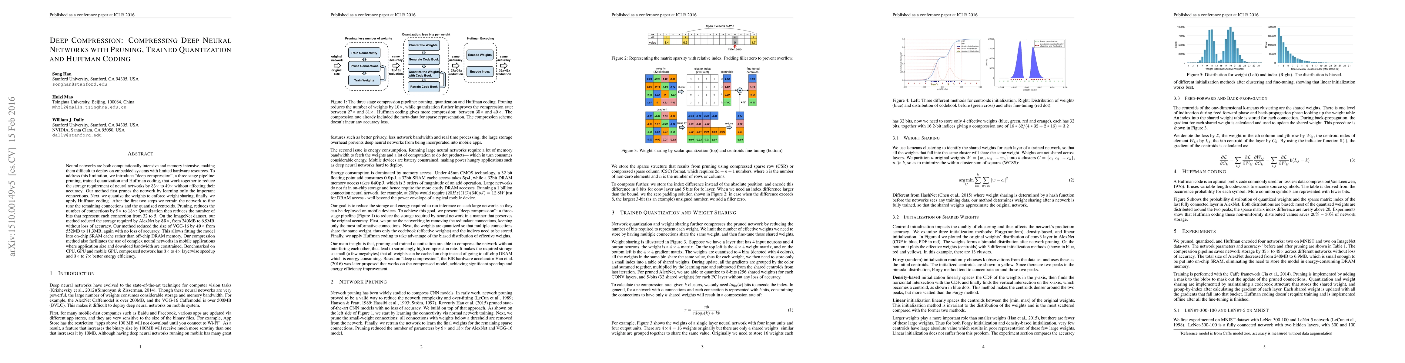 Neural networks are both computationally intensive and memory intensive, making them difficult to deploy on embedded systems with limited hardware resources. To address this limitation, we introduce "deep compression", a three stage pipeline: pruning, trained quantization and Huffman coding, that work together to reduce the storage requirement of neural networks by 35x to 49x without affecting their accuracy. Our method first prunes the network by learning only the important connections. Next, we quantize the weights to enforce weight sharing, finally, we apply Huffman coding. After the first two steps we retrain the network to fine tune the remaining connections and the quantized centroids. Pruning, reduces the number of connections by 9x to 13x; Quantization then reduces the number of bits that represent each connection from 32 to 5. On the ImageNet dataset, our method reduced the storage required by AlexNet by 35x, from 240MB to 6.9MB, without loss of accuracy. Our method reduced the size of VGG-16 by 49x from 552MB to 11.3MB, again with no loss of accuracy. This allows fitting the model into on-chip SRAM cache rather than off-chip DRAM memory. Our compression method also facilitates the use of complex neural networks in mobile applications where application size and download bandwidth are constrained. Benchmarked on CPU, GPU and mobile GPU, compressed network has 3x to 4x layerwise speedup and 3x to 7x better energy efficiency.