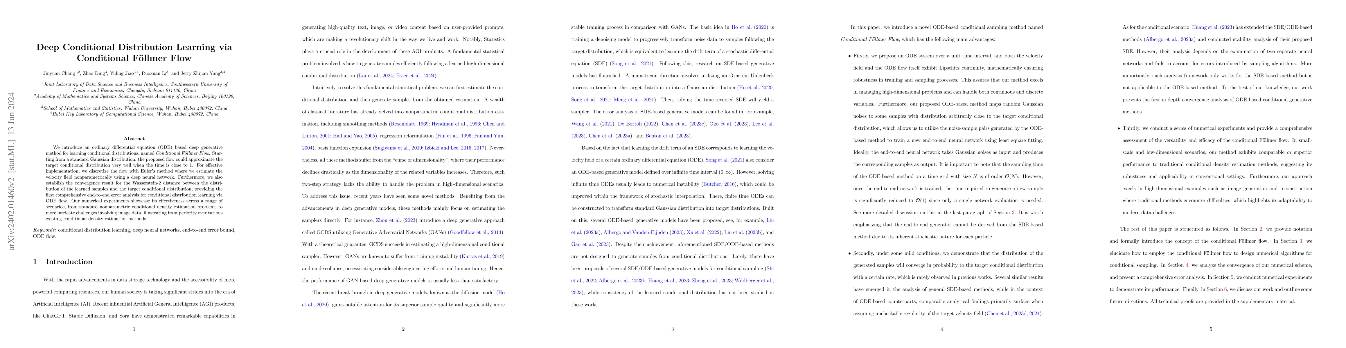 This paper proposes a deep generative method called Conditional F\"ollmer Flow, based on ordinary differential equations to learn conditional distributions. The method uses Euler's discretization with a neural network to estimate the velocity field, and it provides an end-to-end error analysis and demonstrates superior performance in various conditional density estimation tasks.