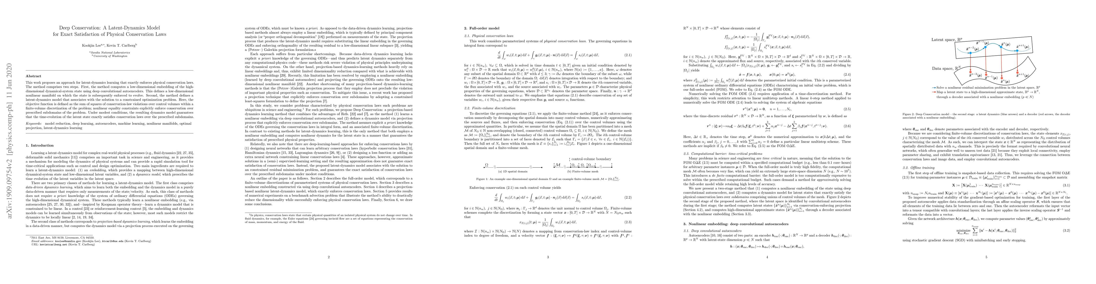 The paper introduces a deep learning method that enforces physical conservation laws through latent-dynamics modeling, using convolutional autoencoders for state embedding and a constrained optimization approach to ensure exact conservation. This approach guarantees exact satisfaction of conservation laws in the latent state dynamics.
