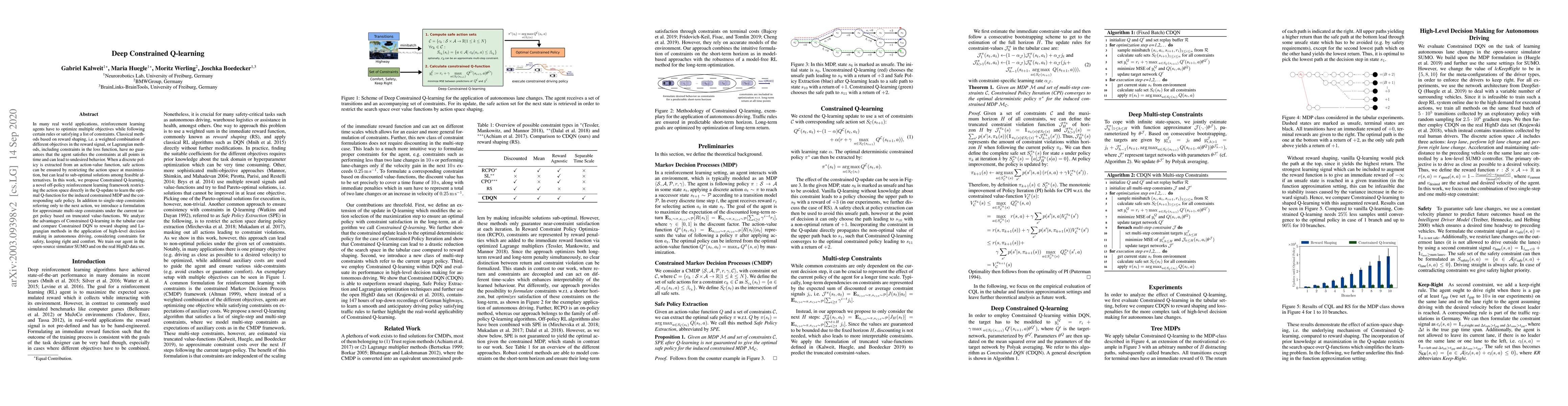 In many real world applications, reinforcement learning agents have to optimize multiple objectives while following certain rules or satisfying a list of constraints. Classical methods based on reward shaping, i.e. a weighted combination of different objectives in the reward signal, or Lagrangian methods, including constraints in the loss function, have no guarantees that the agent satisfies the constraints at all points in time and can lead to undesired behavior. When a discrete policy is extracted from an action-value function, safe actions can be ensured by restricting the action space at maximization, but can lead to sub-optimal solutions among feasible alternatives. In this work, we propose Constrained Q-learning, a novel off-policy reinforcement learning framework restricting the action space directly in the Q-update to learn the optimal Q-function for the induced constrained MDP and the corresponding safe policy. In addition to single-step constraints referring only to the next action, we introduce a formulation for approximate multi-step constraints under the current target policy based on truncated value-functions. We analyze the advantages of Constrained Q-learning in the tabular case and compare Constrained DQN to reward shaping and Lagrangian methods in the application of high-level decision making in autonomous driving, considering constraints for safety, keeping right and comfort. We train our agent in the open-source simulator SUMO and on the real HighD data set.