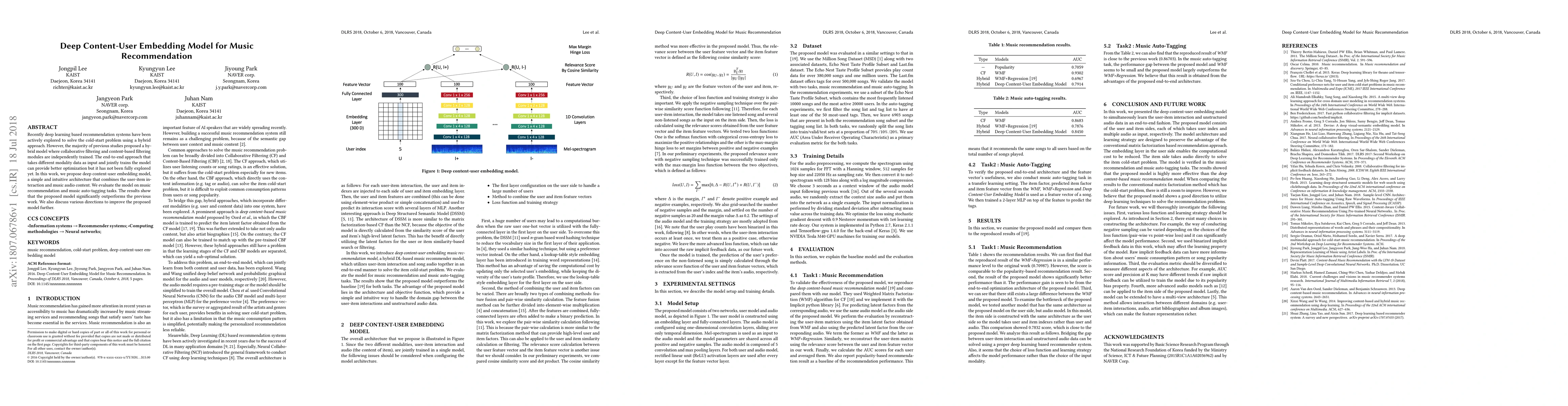This paper proposes a deep content-user embedding model that integrates user-item interaction and music audio content in a single, end-to-end trainable architecture to enhance music recommendation and auto-tagging. The model outperforms previous hybrid approaches and suggests avenues for further improvements.
