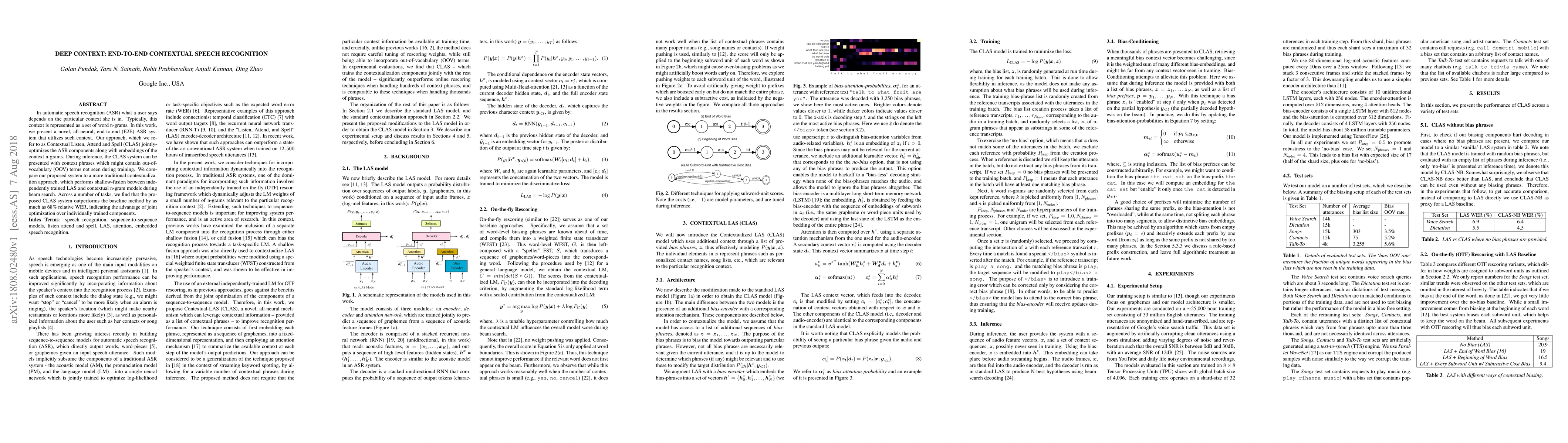 In automatic speech recognition (ASR) what a user says depends on the particular context she is in. Typically, this context is represented as a set of word n-grams. In this work, we present a novel, all-neural, end-to-end (E2E) ASR sys- tem that utilizes such context. Our approach, which we re- fer to as Contextual Listen, Attend and Spell (CLAS) jointly- optimizes the ASR components along with embeddings of the context n-grams. During inference, the CLAS system can be presented with context phrases which might contain out-of- vocabulary (OOV) terms not seen during training. We com- pare our proposed system to a more traditional contextualiza- tion approach, which performs shallow-fusion between inde- pendently trained LAS and contextual n-gram models during beam search. Across a number of tasks, we find that the pro- posed CLAS system outperforms the baseline method by as much as 68% relative WER, indicating the advantage of joint optimization over individually trained components. Index Terms: speech recognition, sequence-to-sequence models, listen attend and spell, LAS, attention, embedded speech recognition.