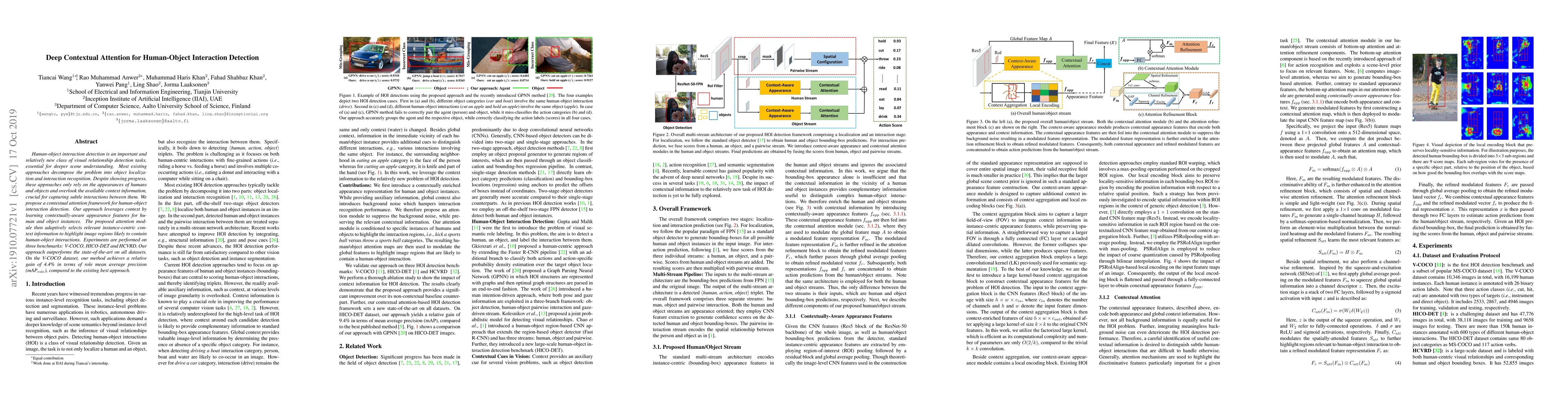 This paper proposes a contextual attention framework to enhance human-object interaction detection by incorporating context-aware features, outperforming existing methods on V-COCO, HICO-DET, and HCVRD benchmarks, achieving a 4.4% relative gain in role mean average precision.