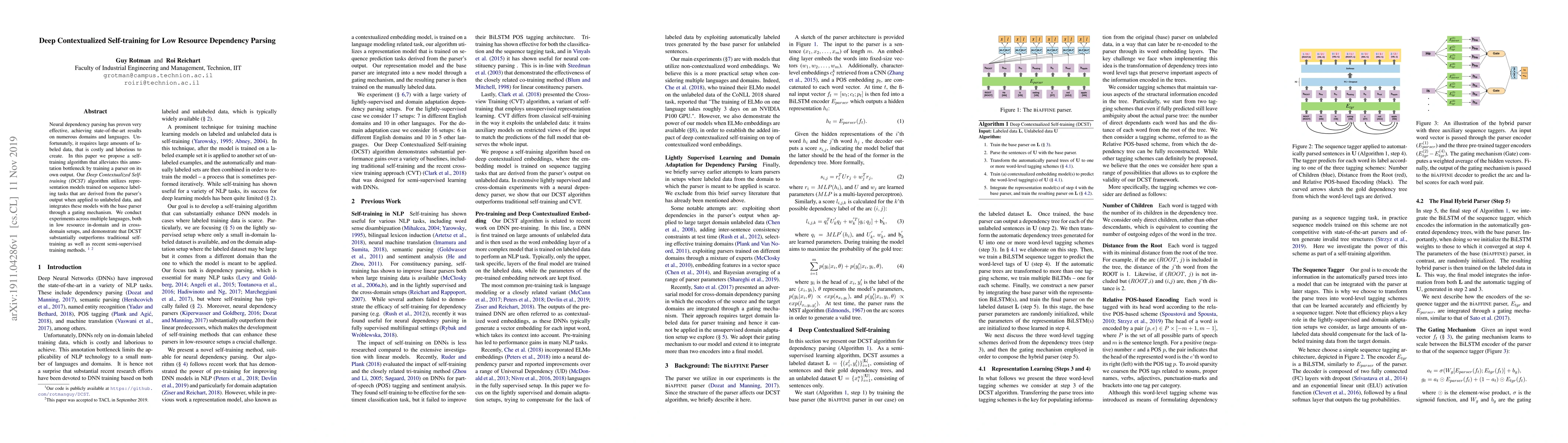 This paper proposes a self-training algorithm called Deep Contextualized Self-training (DCST) to improve neural dependency parsing in low-resource settings. DCST leverages the parser's own output on unlabeled data to generate contextualized representations, which it integrates with the base parser, achieving superior performance over traditional self-training and semi-supervised methods across multiple languages.