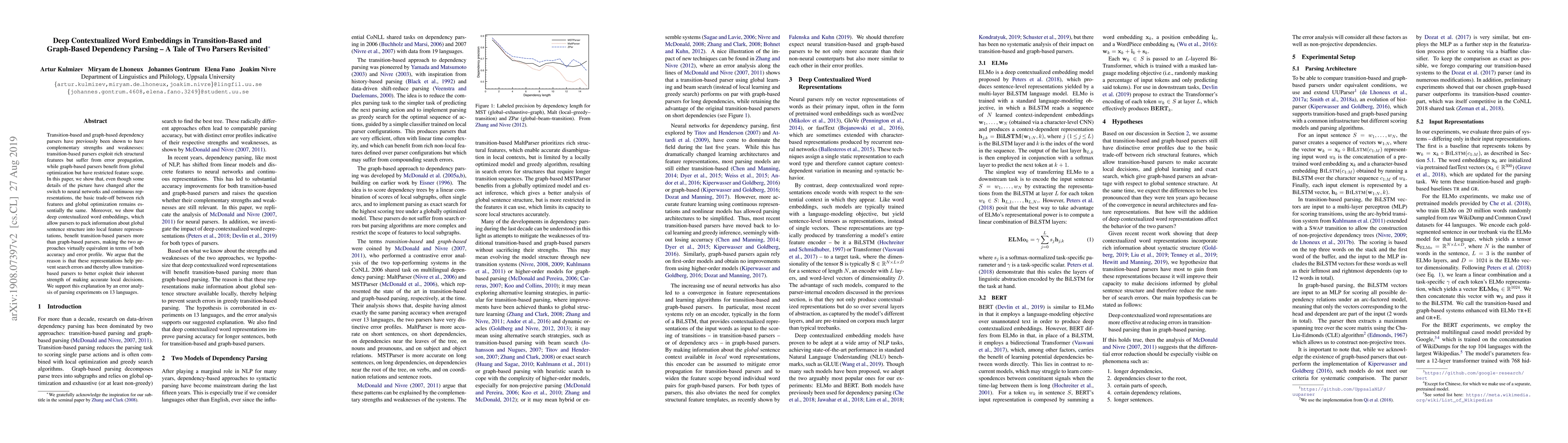 This paper investigates the impact of deep contextualized word embeddings on transition-based and graph-based dependency parsers, finding that they benefit transition-based parsers more, leading to nearly equivalent performance across both approaches due to improved local decision accuracy. An error analysis across 13 languages supports this conclusion.