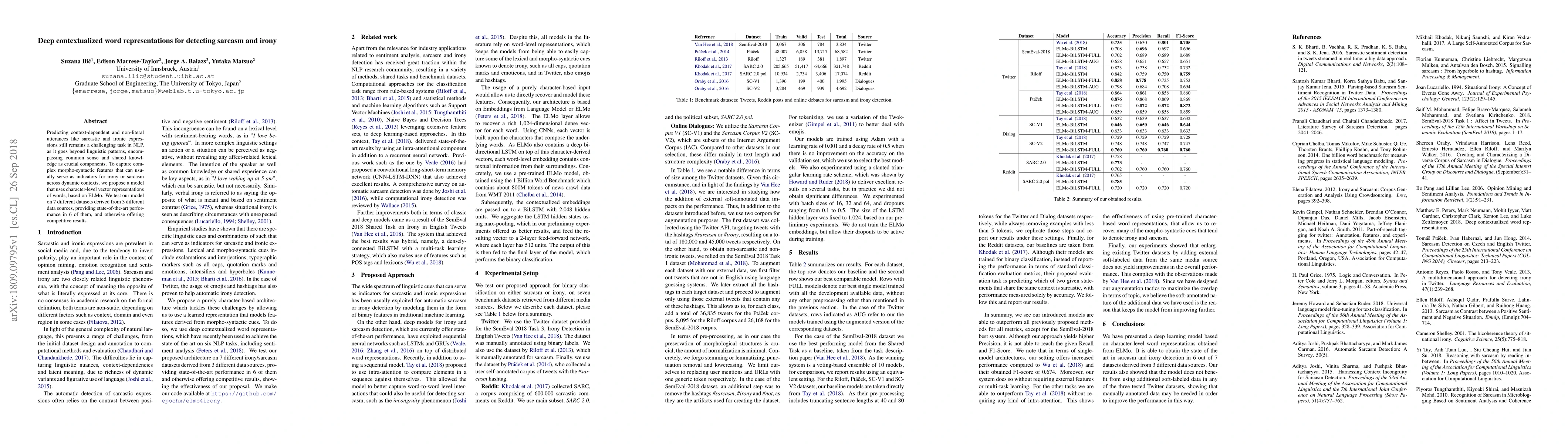 Predicting context-dependent and non-literal utterances like sarcastic and ironic expressions still remains a challenging task in NLP, as it goes beyond linguistic patterns, encompassing common sense and shared knowledge as crucial components. To capture complex morpho-syntactic features that can usually serve as indicators for irony or sarcasm across dynamic contexts, we propose a model that uses character-level vector representations of words, based on ELMo. We test our model on 7 different datasets derived from 3 different data sources, providing state-of-the-art performance in 6 of them, and otherwise offering competitive results.