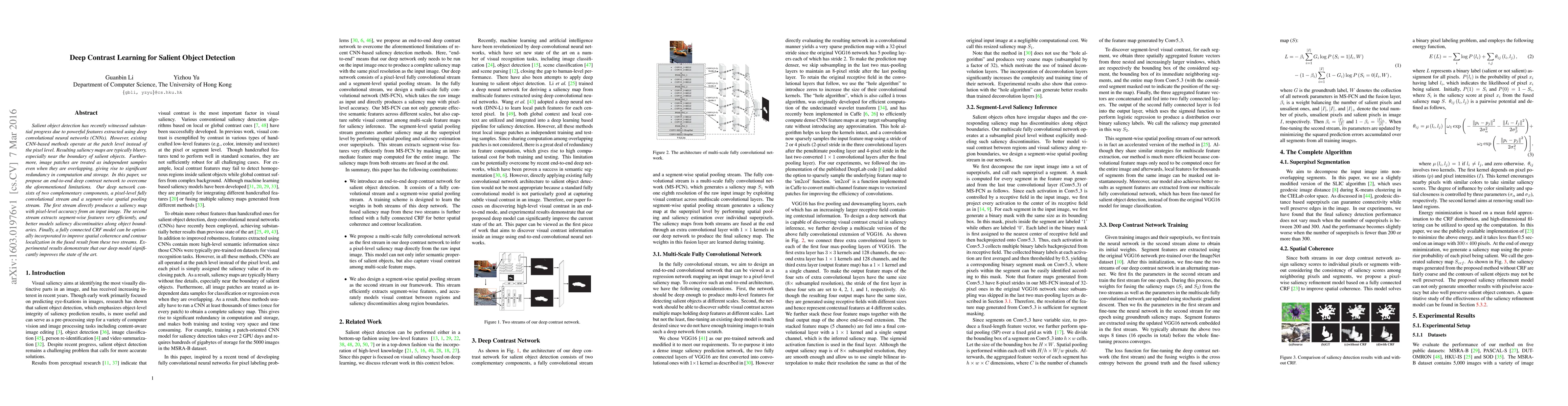 Salient object detection has recently witnessed substantial progress due to powerful features extracted using deep convolutional neural networks (CNNs). However, existing CNN-based methods operate at the patch level instead of the pixel level. Resulting saliency maps are typically blurry, especially near the boundary of salient objects. Furthermore, image patches are treated as independent samples even when they are overlapping, giving rise to significant redundancy in computation and storage. In this CVPR 2016 paper, we propose an end-to-end deep contrast network to overcome the aforementioned limitations. Our deep network consists of two complementary components, a pixel-level fully convolutional stream and a segment-wise spatial pooling stream. The first stream directly produces a saliency map with pixel-level accuracy from an input image. The second stream extracts segment-wise features very efficiently, and better models saliency discontinuities along object boundaries. Finally, a fully connected CRF model can be optionally incorporated to improve spatial coherence and contour localization in the fused result from these two streams. Experimental results demonstrate that our deep model significantly improves the state of the art.