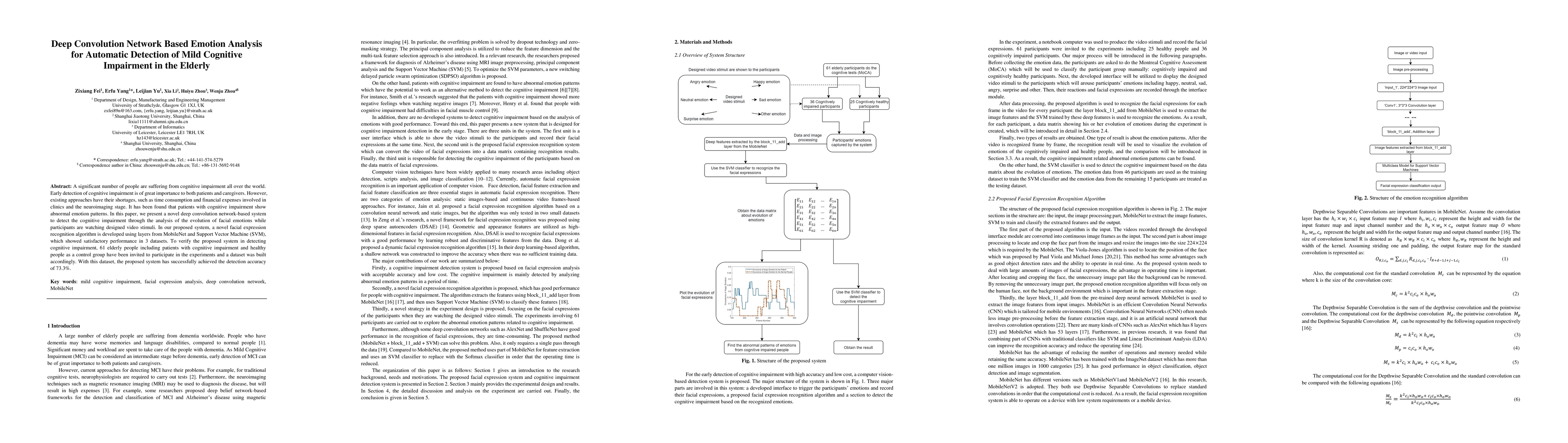 This paper introduces a deep convolution network system for detecting mild cognitive impairment in elderly individuals through the analysis of facial emotion patterns. The system combines a novel facial expression recognition algorithm based on MobileNet and SVM, achieving 73.3% accuracy in detecting cognitive impairment in a dataset of 61 elderly participants.
