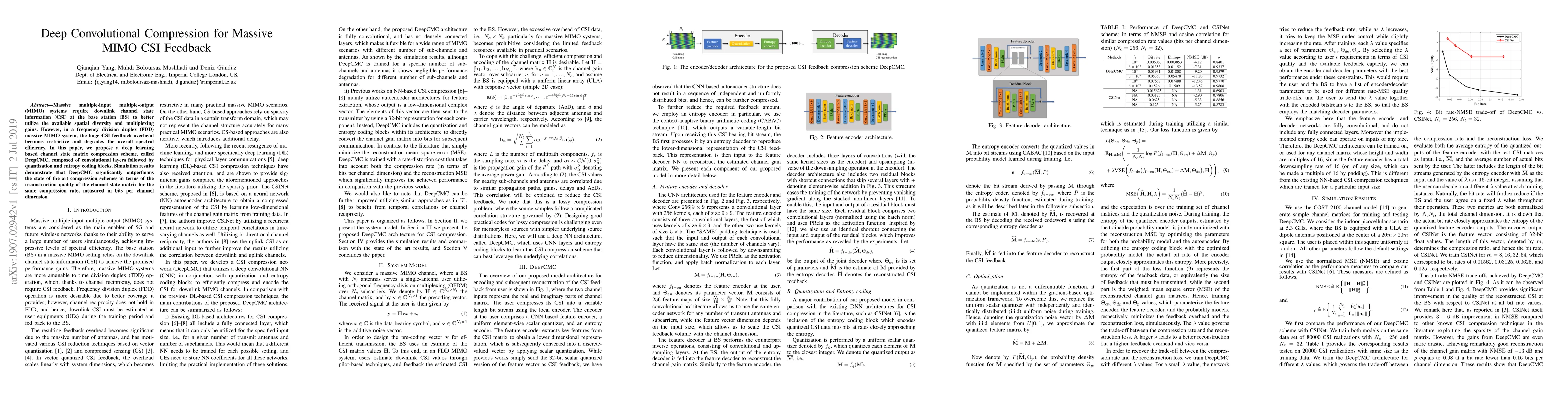 This paper proposes DeepCMC, a deep convolutional compression scheme for reducing CSI feedback overhead in massive MIMO systems. DeepCMC leverages convolutional layers, quantization, and entropy coding to optimize both compression rate and reconstruction quality, outperforming existing methods in simulations.