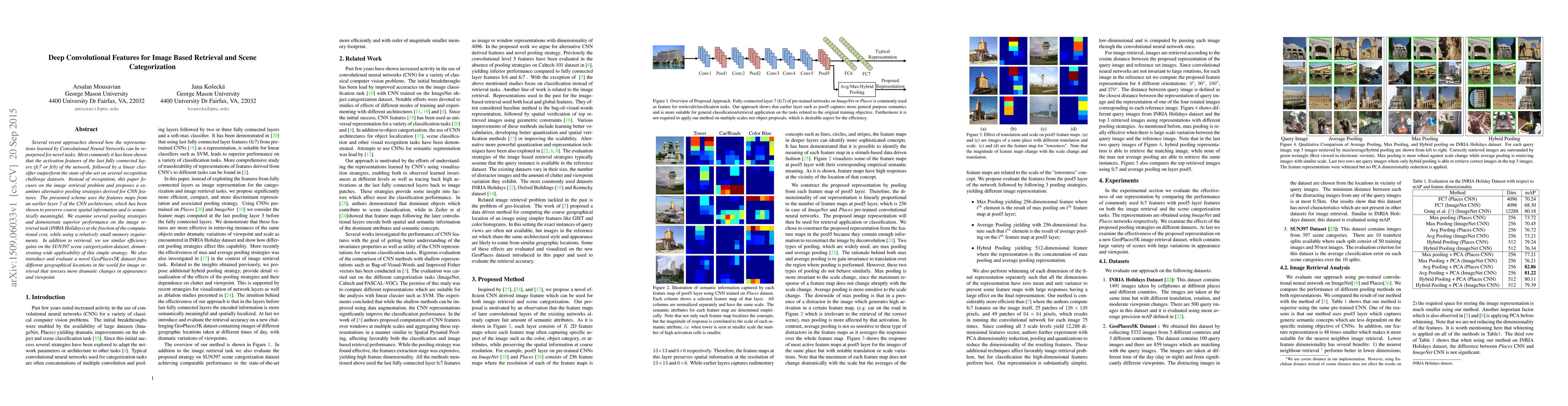 This paper explores the use of convolutional features from earlier layers of CNNs for image retrieval and scene categorization, proposing alternative pooling strategies that achieve superior performance with lower computational costs and memory requirements. The method is shown to be effective on both the INRIA Holidays and SUN397 datasets, and a new GeoPlaces5K dataset is introduced to test under more challenging conditions.