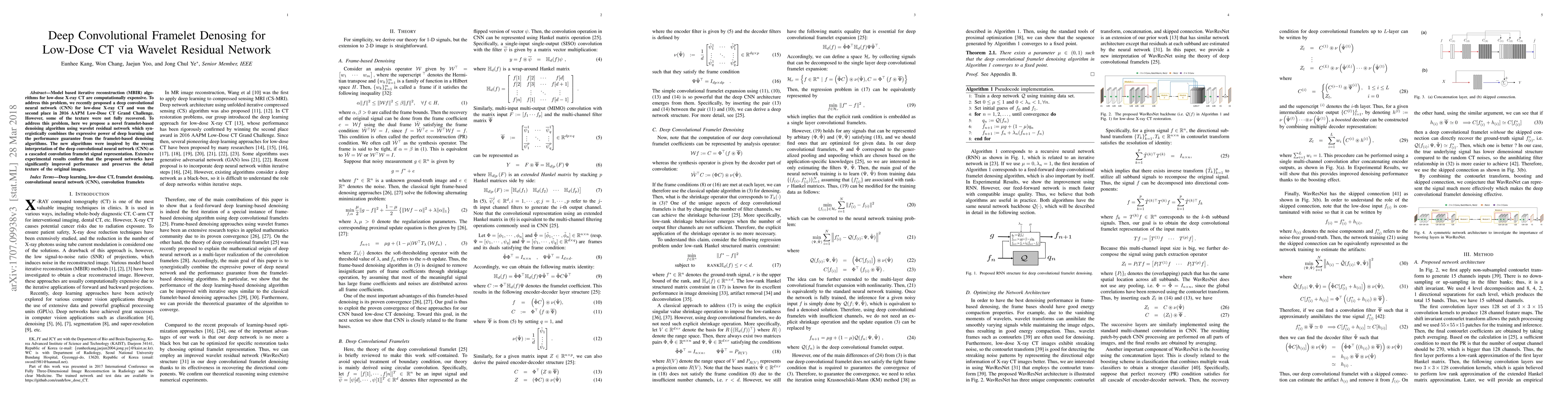 This paper proposes a novel deep convolutional framelet denoising algorithm using a wavelet residual network to enhance low-dose CT reconstruction. By combining deep learning with framelet-based denoising, the method significantly improves image quality and texture recovery compared to previous CNN-based approaches.
