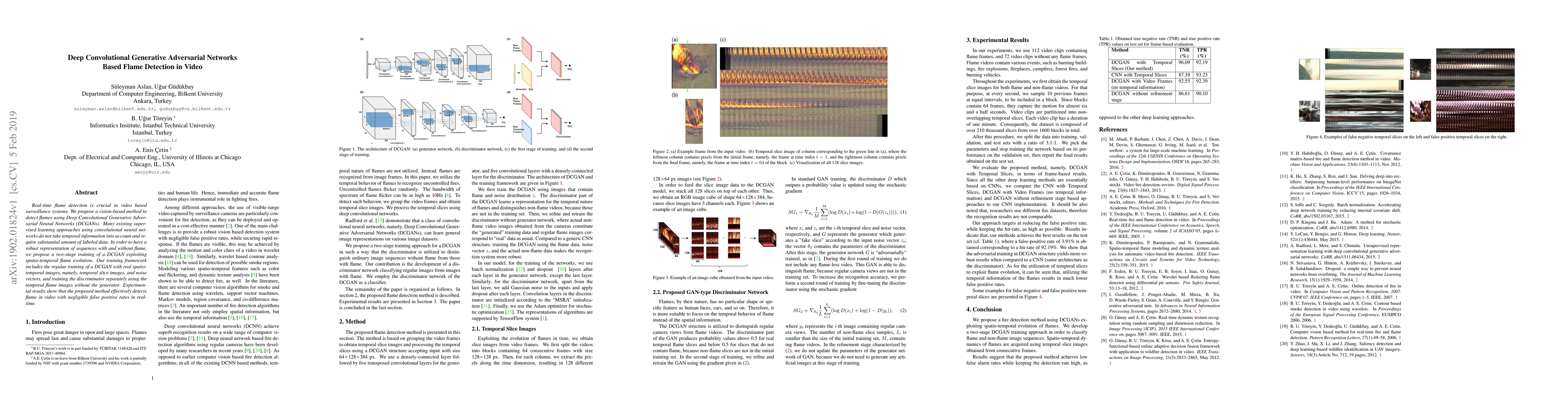 This paper proposes a deep convolutional generative adversarial network (DCGAN) method for real-time flame detection in video surveillance. The approach leverages spatio-temporal flame evolution through a two-stage training process, achieving robust flame detection with minimal false positives.