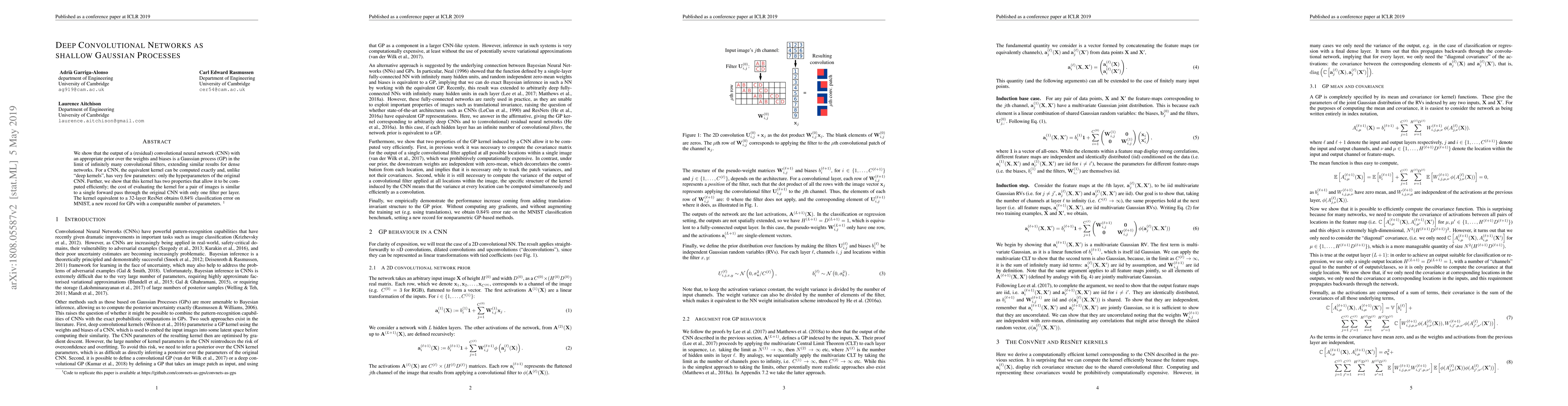 A deep convolutional network can be viewed as a Gaussian process with a minimal number of parameters, enabling efficient evaluation of kernel values. This equivalence achieves state-of-the-art performance on MNIST classification with a comparable number of parameters.