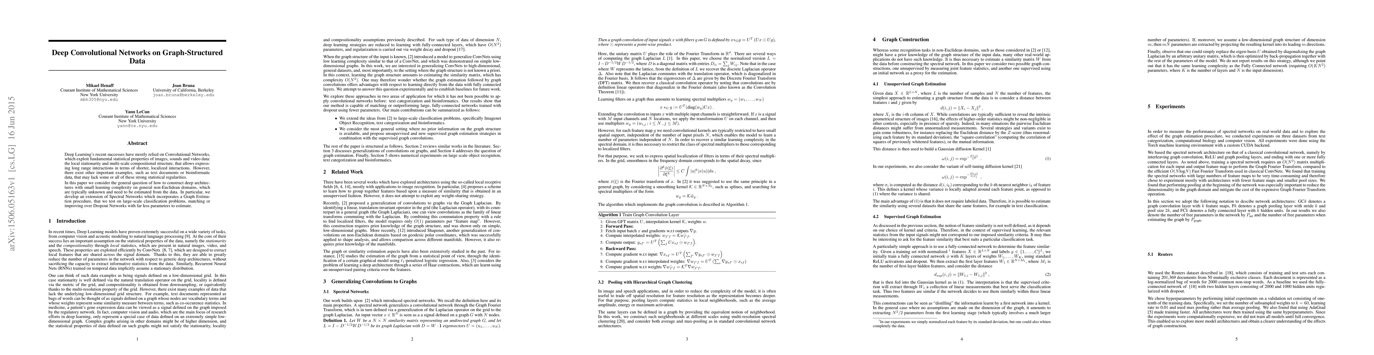 This paper explores the adaptation of Convolutional Networks for graph-structured data, proposing an extension of Spectral Networks with a Graph Estimation procedure. The method is shown to achieve competitive performance on large-scale classification tasks with fewer parameters compared to Dropout Networks.
