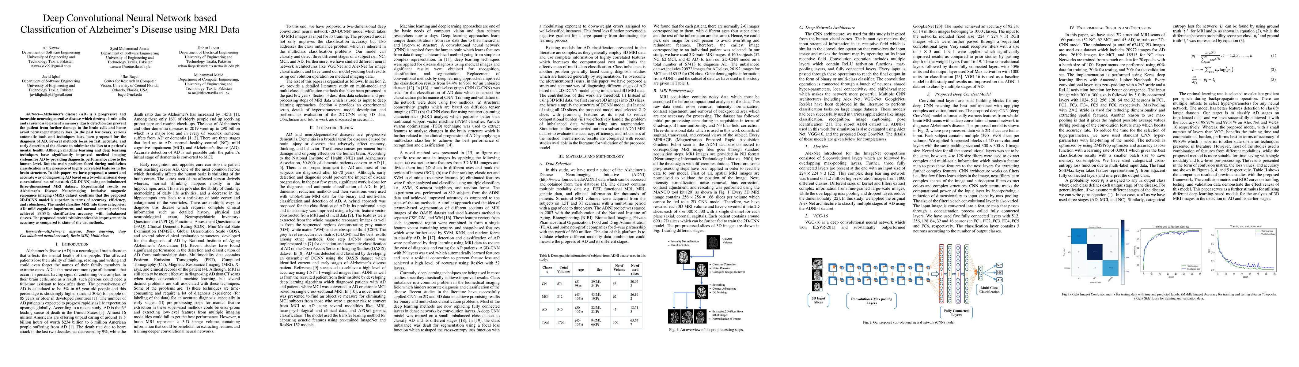 This paper proposes a 2D-DCNN model for classifying Alzheimer's disease using MRI data, achieving 99.89% accuracy. The model outperforms state-of-the-art methods by effectively handling imbalanced datasets and distinguishing between AD, mild cognitive impairment, and normal controls.