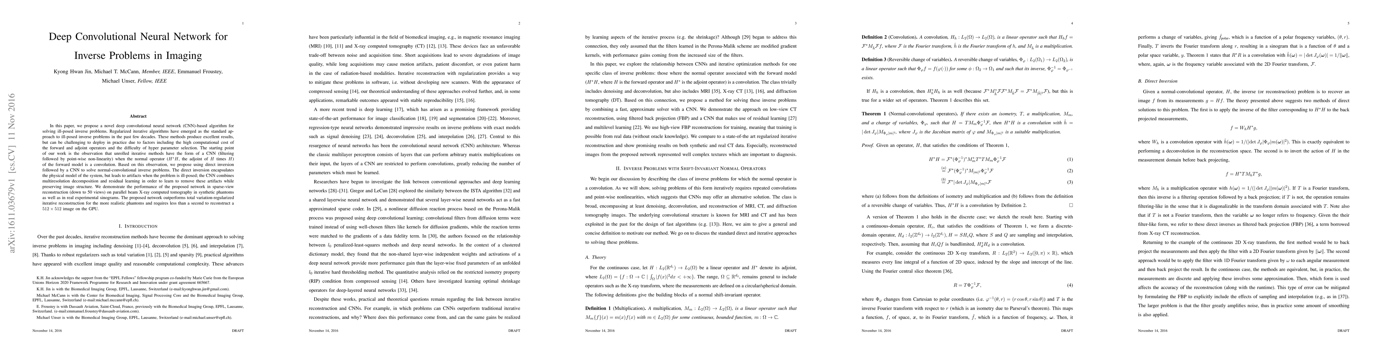 This paper proposes a deep convolutional neural network (CNN) to solve ill-posed inverse problems in imaging, specifically leveraging direct inversion followed by CNN to remove artifacts while preserving image structure. The network outperforms traditional iterative methods in sparse-view reconstruction for X-ray computed tomography.