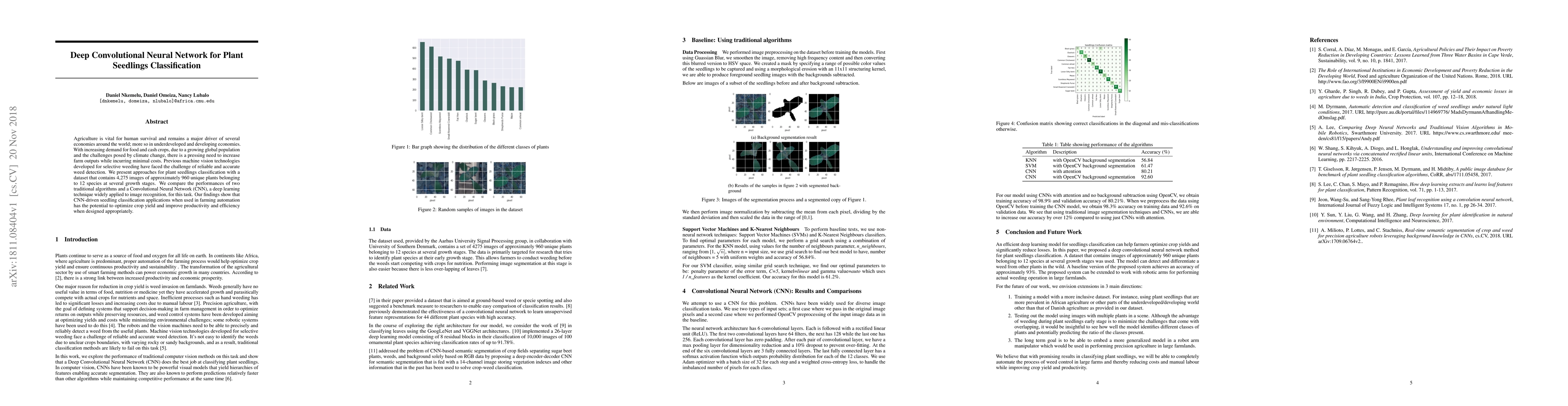 Agriculture is vital for human survival and remains a major driver of several economies around the world; more so in underdeveloped and developing economies. With increasing demand for food and cash crops, due to a growing global population and the challenges posed by climate change, there is a pressing need to increase farm outputs while incurring minimal costs. Previous machine vision technologies developed for selective weeding have faced the challenge of reliable and accurate weed detection. We present approaches for plant seedlings classification with a dataset that contains 4,275 images of approximately 960 unique plants belonging to 12 species at several growth stages. We compare the performances of two traditional algorithms and a Convolutional Neural Network (CNN), a deep learning technique widely applied to image recognition, for this task. Our findings show that CNN-driven seedling classification applications when used in farming automation has the potential to optimize crop yield and improve productivity and efficiency when designed appropriately.