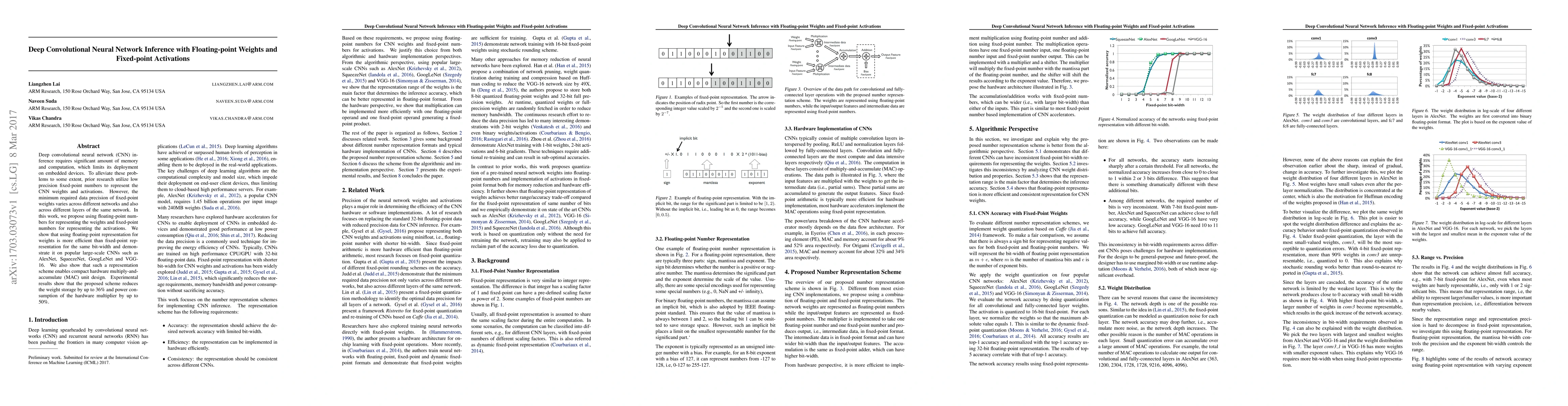 This paper proposes using floating-point weights and fixed-point activations in deep convolutional neural networks to reduce memory and computation requirements. It demonstrates that floating-point weights are more efficient than fixed-point weights for the same bit-width, leading to significant reductions in weight storage and power consumption.