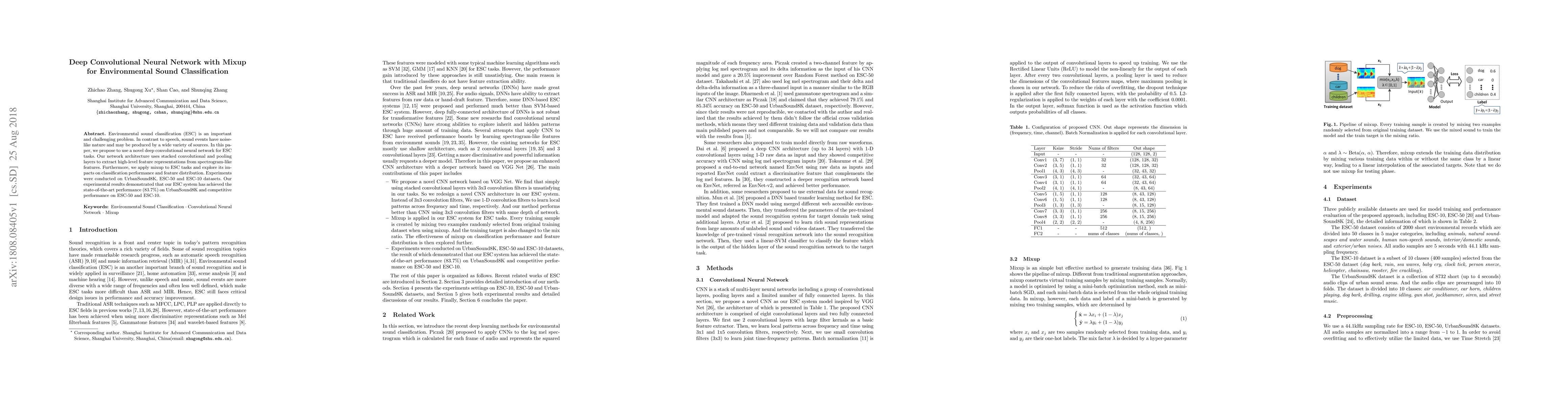 This paper proposes a deep convolutional neural network with mixup for environmental sound classification, achieving state-of-the-art performance on the UrbanSound8K dataset. The network uses convolutional and pooling layers for feature extraction and mixup to improve classification accuracy and feature distribution.