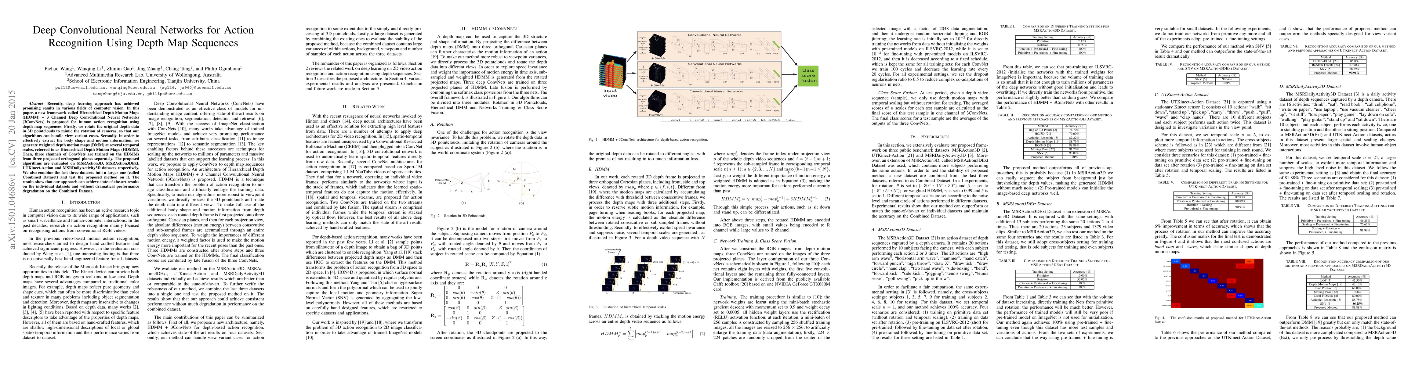 This paper proposes a new framework, Hierarchical Depth Motion Maps (HDMM) + 3 Channel Deep Convolutional Neural Networks (3ConvNets), for human action recognition using depth map sequences. The method achieves state-of-the-art results on multiple datasets by generating DMMs and training ConvNets on orthogonal projections, demonstrating robust performance even when combining datasets.