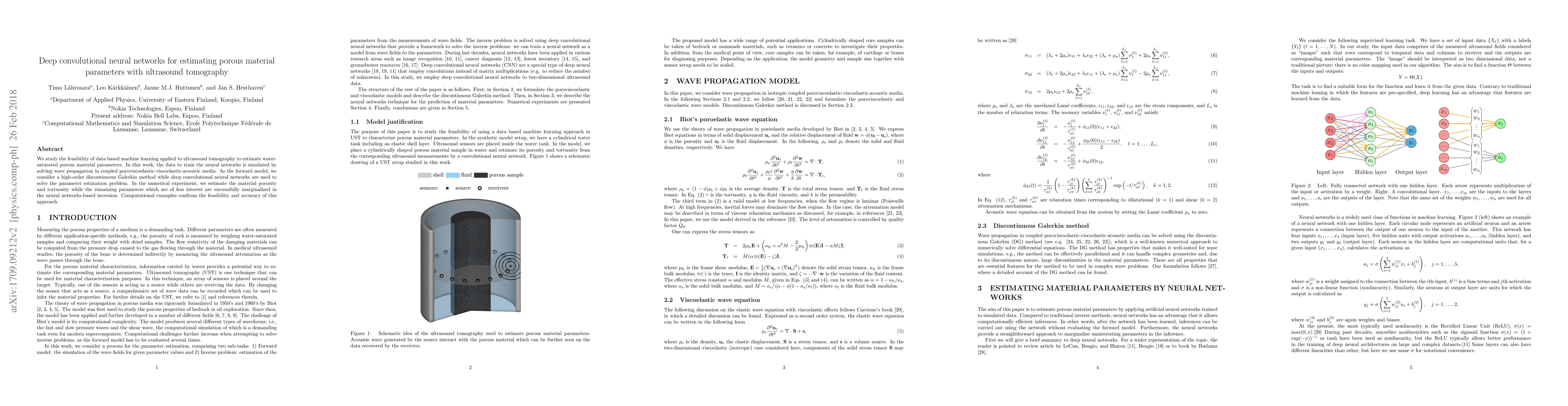 This paper explores the use of deep convolutional neural networks for estimating parameters of water-saturated porous materials using ultrasound tomography. The study employs a high-order discontinuous Galerkin method for simulating wave propagation and training the neural networks, successfully estimating material porosity and tortuosity.