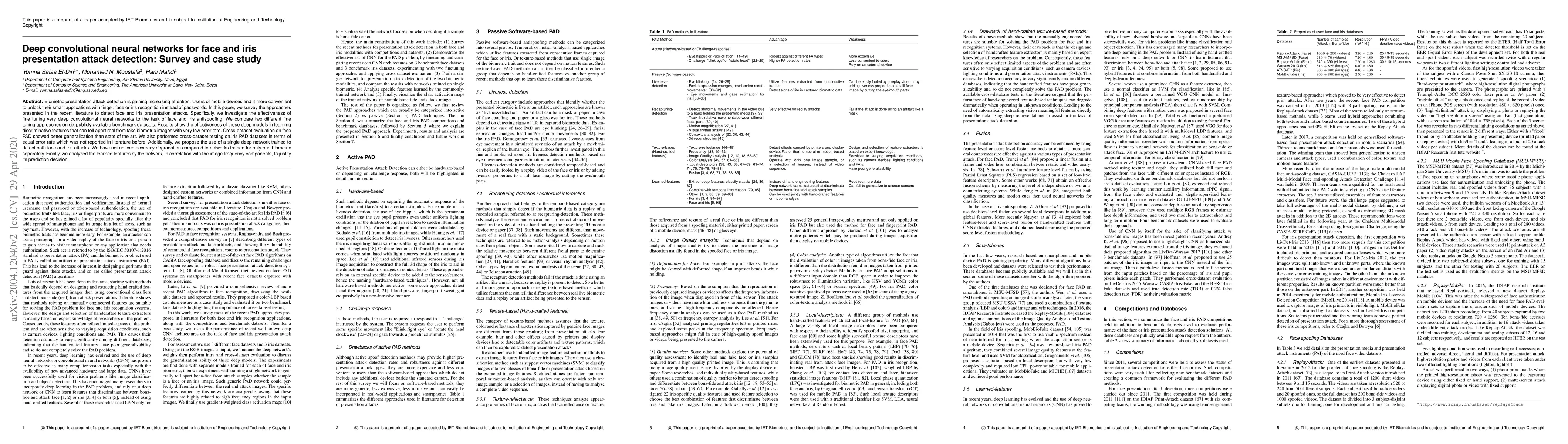 This paper surveys recent literature on detecting face and iris presentation attacks using deep convolutional neural networks, comparing fine-tuning approaches on benchmark datasets. It finds that deep models effectively learn discriminative features for low error rates, with cross-dataset evaluations showing better generalization for face PAD and novel cross-dataset testing for iris PAD.