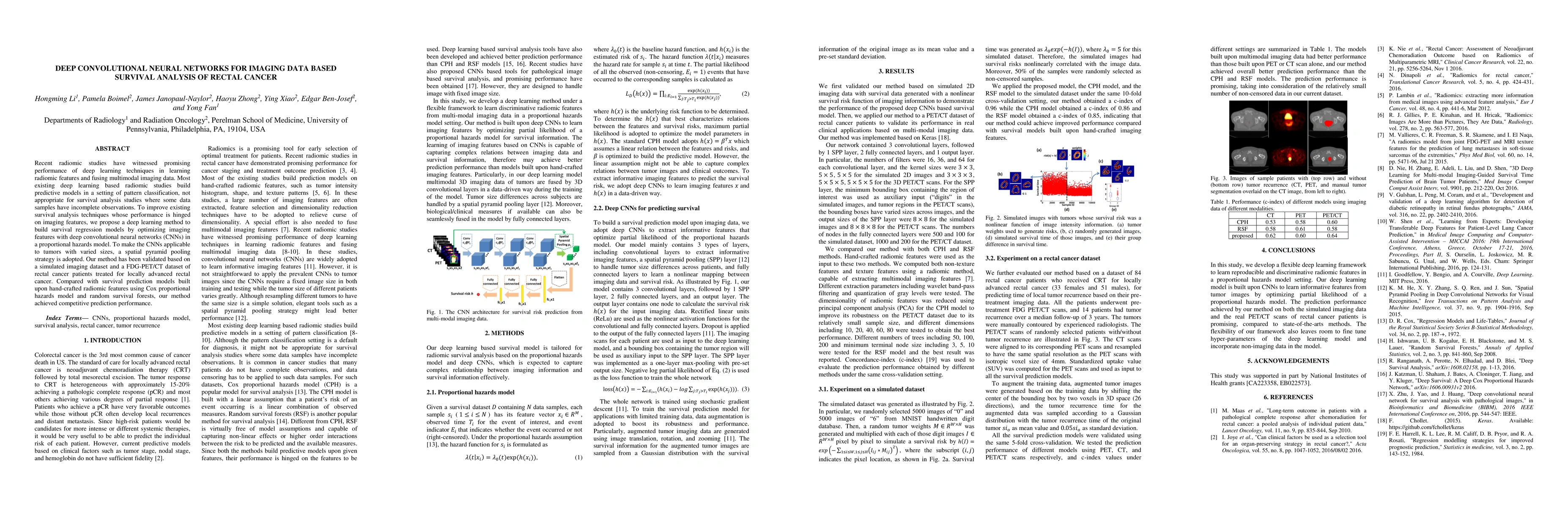 The research proposes a deep learning method using deep convolutional neural networks (CNNs) optimized in a proportional hazards model for survival regression in rectal cancer. A spatial pyramid pooling strategy is adopted to handle tumor size variations across patients.